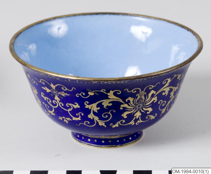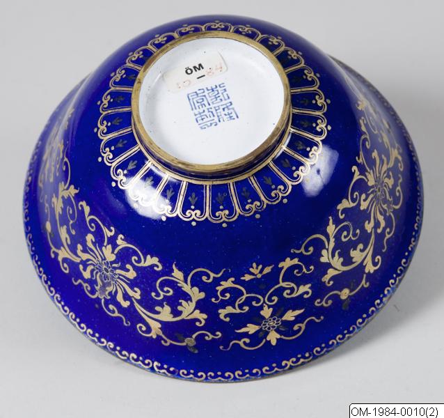 2 (se även nr. 84/11) skålar på låg fot med utsvängd mynning. Emalj på koppar. Insidan turkos. Utsidan mörkblå med målad dekor i guld med accenter i svart. Dekoren visar en stiliserad lotusranka med blommor runt skålens mitt, en smal geometrisk bård kängs mynningen, en bård av lotusblad längs foten samt ett enkelt prickmönster runt foten. (Från Ängsö)