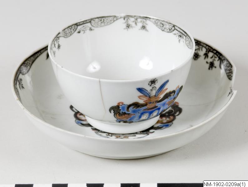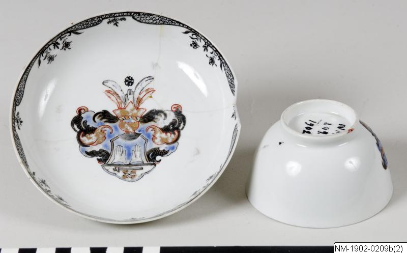 • Kopp med fat, prydda med adligt vapen i guld och tusch. Kinesiskt, 1700-talet.