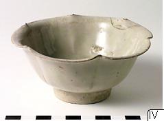 Liten skål av glaserad keramik. Skålen är sexpassformad och glaserad med svagt grön glasyr. Loberingen är utmärkt genom inskärningar på utsidan. I skålens mitt finns ett ringformat märke som sannolikt kommer från det rörformade stöd som använts för skålar vid bränningen. Enligt Ruth Prior är skålen av drejat stengods, möjligen porslin, tillverkat i oxiderad bränning. Föremålet kommer möjligen från Sawankhalok, med tanke på det ringformade märket i skålens mitt. Formen liknar de lotusformer som fanns på keramik i Kina under Song-dynastin. Dateras till 12-1500-talet. För en jämförelse med formen, se Chinese and South-East Asian White Ware Found in the Philippines av R.C. Tan et al., 1993, s. 90, plansch 55.