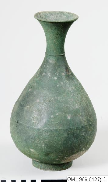 This bronze bottle has a flaring mouth and a round, pear-shaped body. Horizontal bands around the lip and the neck, as well as incised lines on the interior of the mouth, the shoulder and around the belly, add a decorative element to the austere elegance of the bottle. The bottle was probably turned on a lathe, in several pieces, and soldered together. The joint lines were covered with decorative bands. The foot and base were made separately and attached, probably soldered, to the body of the vessel. The surface is dented in several places and covered almost entirely with a green patina. Bottles of this shape were produced in metal and ceramics. The metal version is assumed to have been used in Buddhist rituals for holding and pouring water or as wine or water bottles in households of the Goryeo aristocracy (Goryeo dynasty: 918-1392).