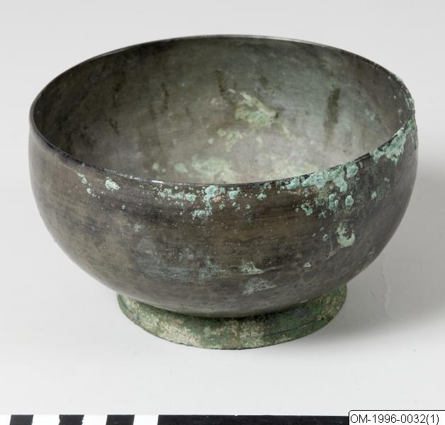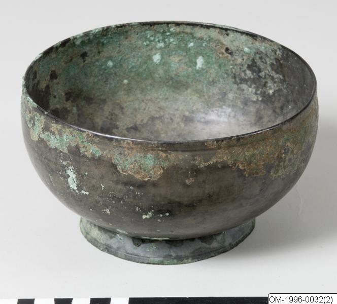This bronze bowl has a defined lip and gently rounded sides. An incised line encircles the foot. The production technique involved casting, probably beating and finishing on a lathe. The foot was made separately and attached to the bottom of the vessel with two pins. The surface is patinated.