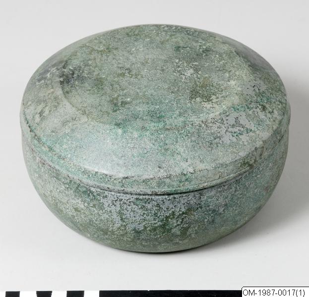 This bronze bowl has a lid with a flat top that slopes in a diagonal line and angles down to the rim. A design of incised, concentric rings adorns the flat top of the lid: a narrow double ring at the centre, a triple ring in the middle and another triple ring at the edge. Another incised line runs around the rim. The container has a wide mouth with an inverted rim and vertical walls that only slightly curve. The bowl rests on a flat base without a separate foot. The same incised rings found on the lid can be seen on the container - a single line below the mouthrim and a double ring at the edge of the well. There might be more such decorative rings, that have been covered by the greenish patina and incrustations that cover almost the whole surface of the bowl. The base bears regular turning marks, which implies that the finishing of the surface was worked on a lathe. Like other covered bronze bowls of the Goryeo period, this bowl probably served as a food bowl.