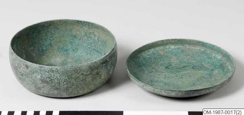 Den här bronsskålen har ett lock med platt ovansida som sluttar diagonalt ner till kanten. Ett ciselerat mönster av koncentriska ringar smyckar lockets ovansida. En smal dubbel ring på lockets mitt, en trippel ring runt denna och en annan trippel ring längst ut vid kanten. En annan ciselerad ring går runt kanten. Behållaren har en vid mynning med inverterad kant och lodräta väggar som endast är lä...