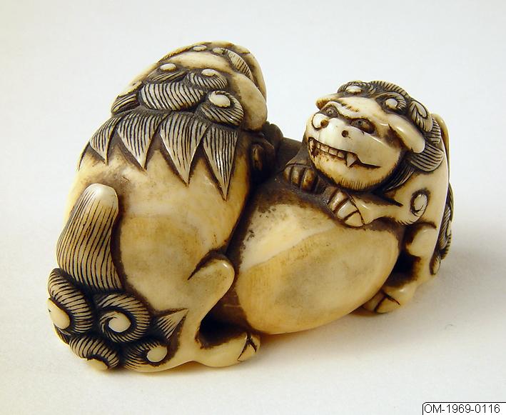 Netsuke av elfenben, från Japan. Två lejon klängande på ett klot. På undersidan inskuren signatur. Kimonon har inga fickor, småsaker kunde läggas i ärmarna och innanför bältet och så kunde man bära olika dosor, pipor och penselfodral på en snodd från bältet. De bärbara sakerna kallas sagemono. Accessoarerna blev särskilt för männen identitetsskapande statusföremål och en viktig del av herrmodet, en egen värld i mindre skala med rika motiv. Olika typer av konstnärligt utformade sagemono är kända fr o m 1600-talet. Förutom tobaksrelaterade dosor är en av de mer kända typerna sigilldosor (inro). Bokstavlig betydelse är en korg (ro) att lägga sigill (in) i. Enligt lag var endast stämplade signaturer giltiga vilket krävde att t ex samurajer och köpmän som hade behov av sigillstämplar fick bära dem med sig i små dosor. Detta var ursprunget till sigilldosor (inro) som snart främst kom att användas för medicinförvaring. Utseendet på accessoarerna varierade efter bärarens smak, ekonomi och modetrender. När västerländsk klädsel med fickor blev populär under Meiji-perioden (1868-1912) minskade behovet av dessa bärbara föremål och de delades ibland upp i sina beståndsdelar (netsuke, s k bältesknappar) för sig och såldes till västerlänningar. (Baserad på text från utställningskatalogen Japan. Föremål och bilder berättar. 2011). Miniatyrskulpturerna, ofta kallade bältesknappar, (netsuke) rymmer en hel värld att utforska. Myter är ett stort motiv. Ofta var designen skyddande, lyckobringande och inte minst underhållande. Netsuke-föremålets funktion består i att vara en motvikt till de "hängande saker" (sagemono) som bars till kimonon av männen. Vanliga hängande saker var olika dosor, till exempel medicindosor (inro) och tobakspungar. Netsuke betyder ungefär "fästa rot" och tidiga netsuke (före sent 1600-tal) var förmodligen naturliga, obearbetade rötter och liknande. Från 1700-talet gjordes de mer föreställande och ofta i trä eller elfenben. Så småningom började konstnärerna att signera sina netsuke. (Baserad på text från utställningen Japan. Föremål och bilder berättar. 2011). /PH