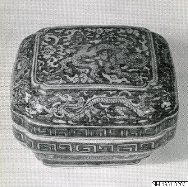 • Ask, med lock, i porslin. Asken är kantig till formen, med avbrytna (invända) hörn. Längs med askens samt lockets kant löper en dekorativ bård med ett meanderliknande mönster. Asken har en ett löpade dekorativt fält ut med sidan. Locket är dekorerat med ett fält som löper längs med sidan och på toppen av locket ett nästintill kvadratiskt dekorativt fält omgiven av en smal ram. Dekoren föreställer ... Visa hela