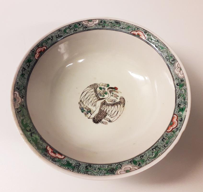 Halvklotformad skål, på låg rund fot. Utsidan rikt dekorerad i flerfärgad glasyr (grönt, rött, aubergine, blått, gult mot svart). Motiv bl.a. blommor och fjärilar. På insidan centrerad dekor, i färg mot vit bakgrund, föreställande en sittande trana med utsträckta vingar. Skålens kant utstickande och dekorerad på både in och utsida. Förfalskning eller senare reproduction av historiskt av kinesiskt porlin. Höjd 7,4 cm, diameter 20,5 cm.