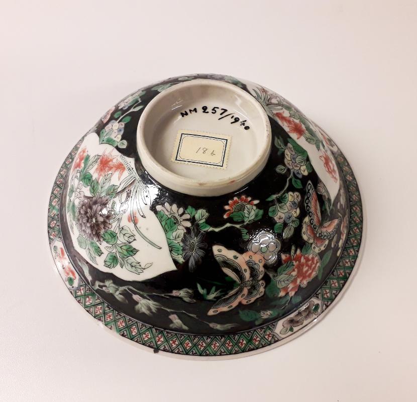 Halvklotformad skål, på låg rund fot. Utsidan rikt dekorerad i flerfärgad glasyr (grönt, rött, aubergine, blått, gult mot svart). Motiv bl.a. blommor och fjärilar. På insidan centrerad dekor, i färg mot vit bakgrund, föreställande en sittande trana med utsträckta vingar. Skålens kant utstickande och dekorerad på både in och utsida. Förfalskning eller senare reproduction av historiskt av kinesiskt ...