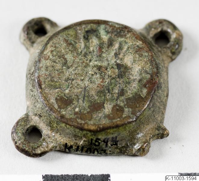 • Välvt beslag med små öglor i hörnen, de ena defekt. Otydligt dekorerat.
