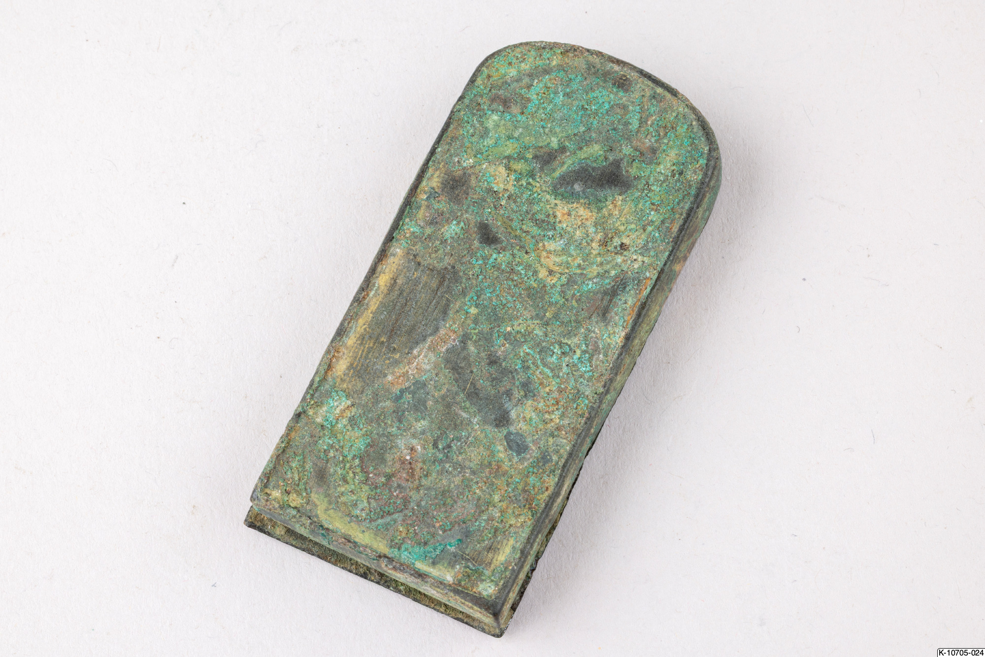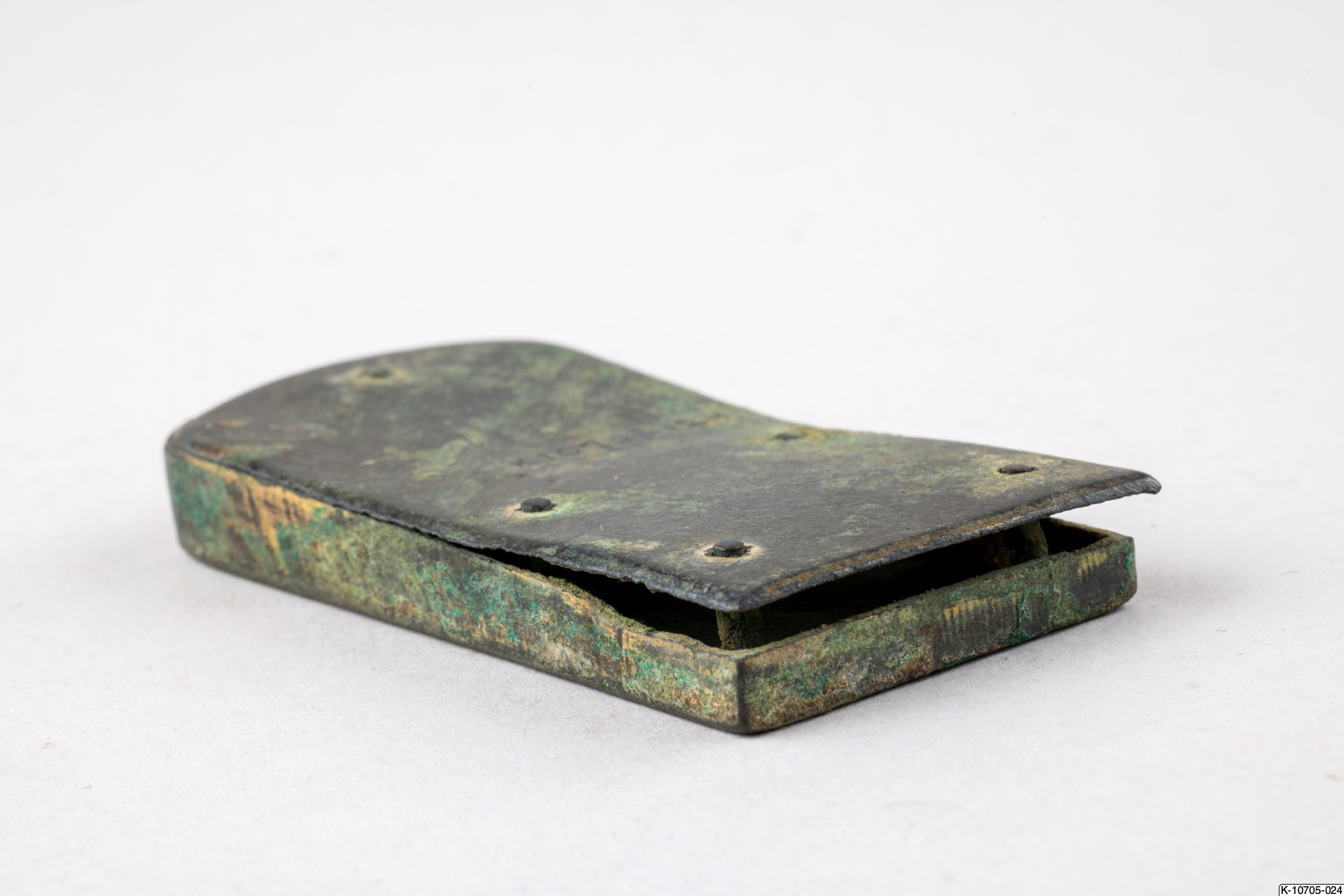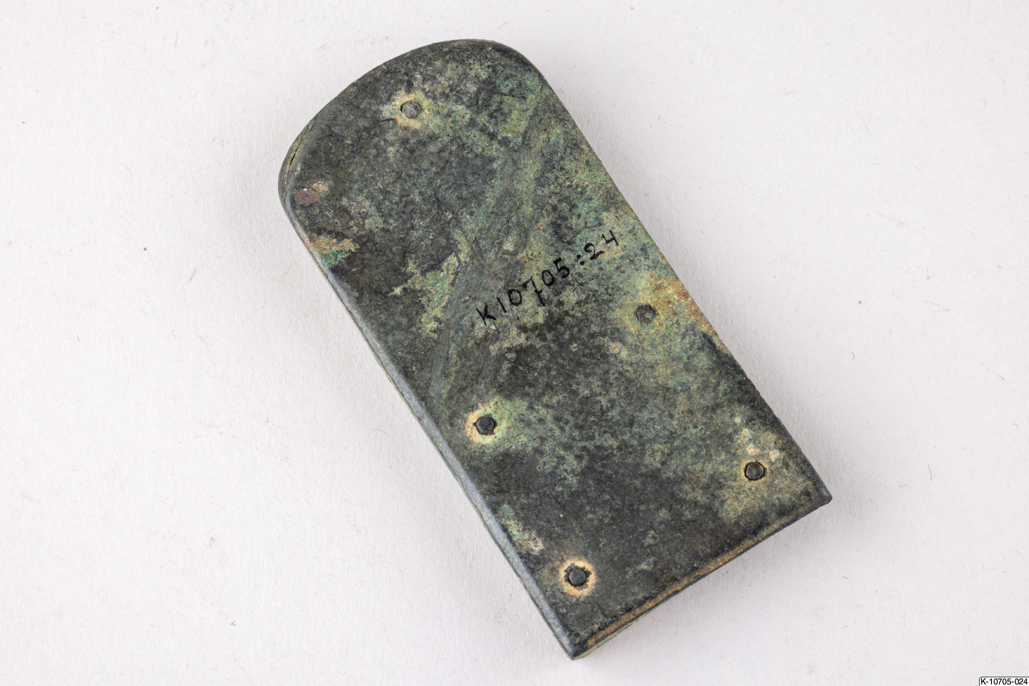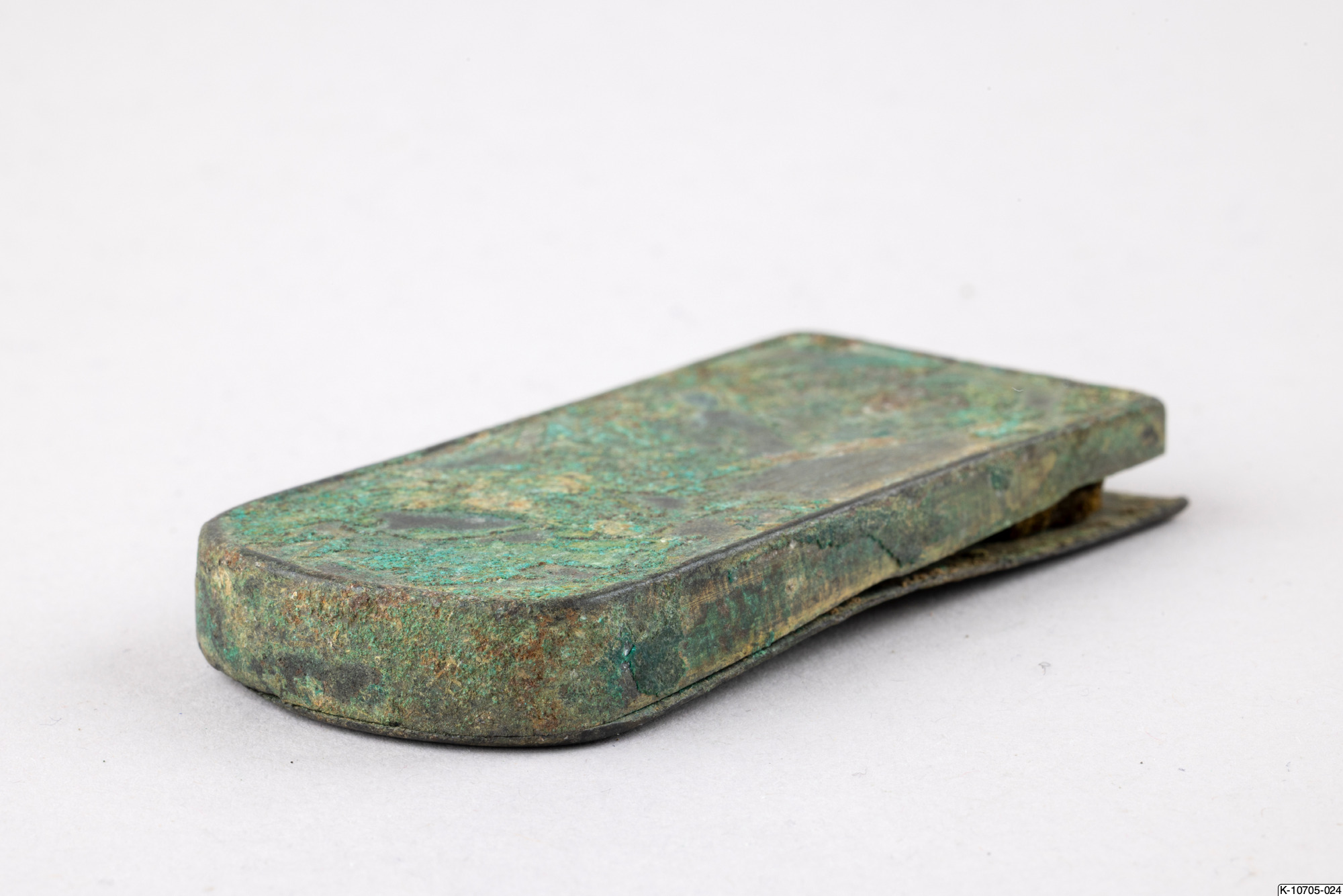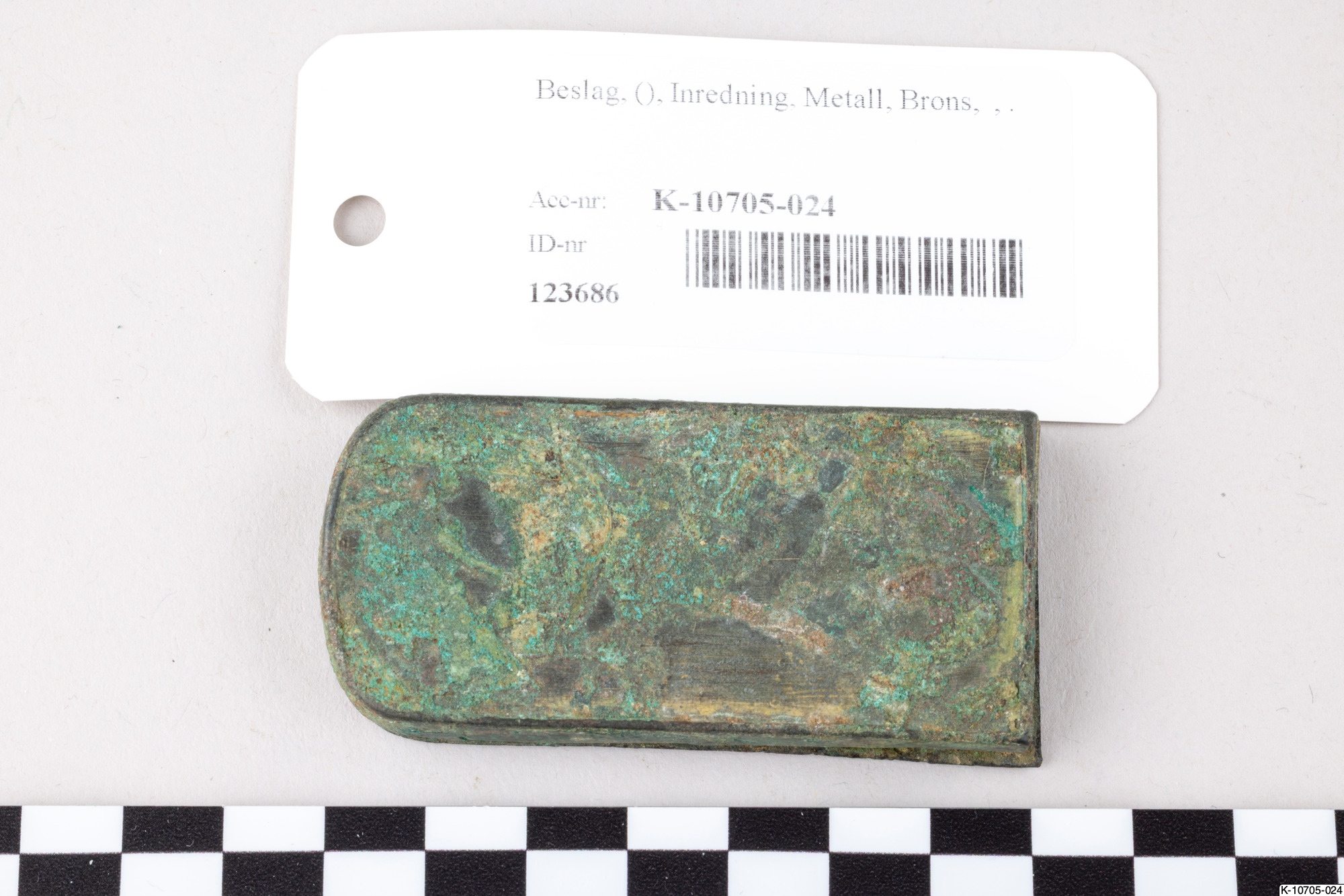 • Beslag, avlångt med markerade kanter och fastnitad underplatta.