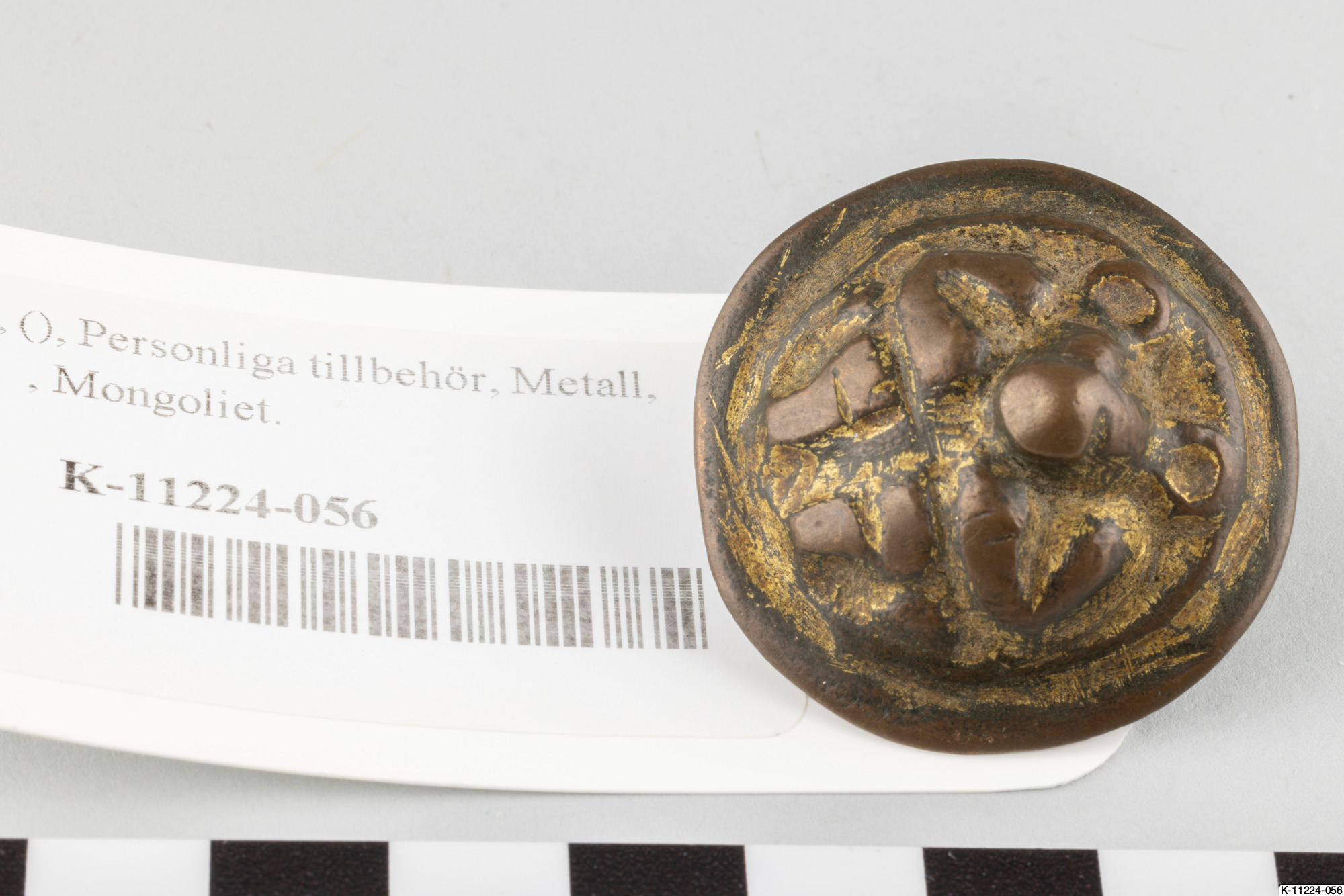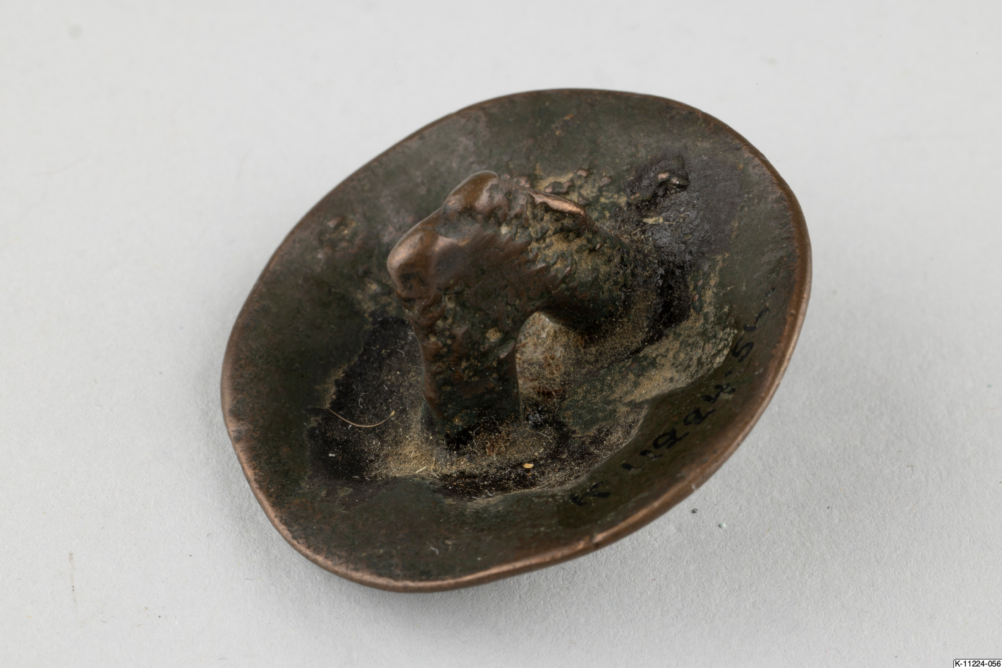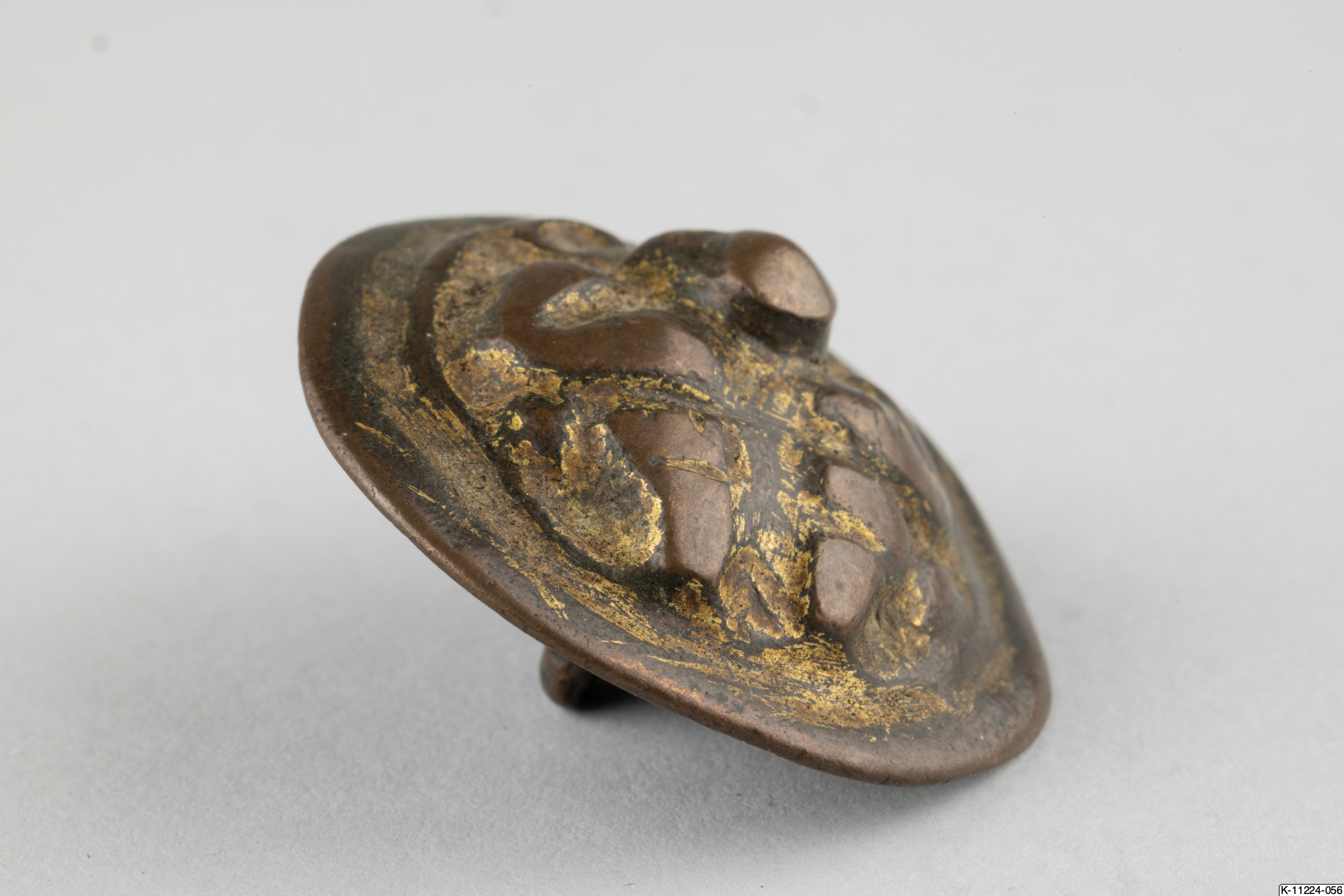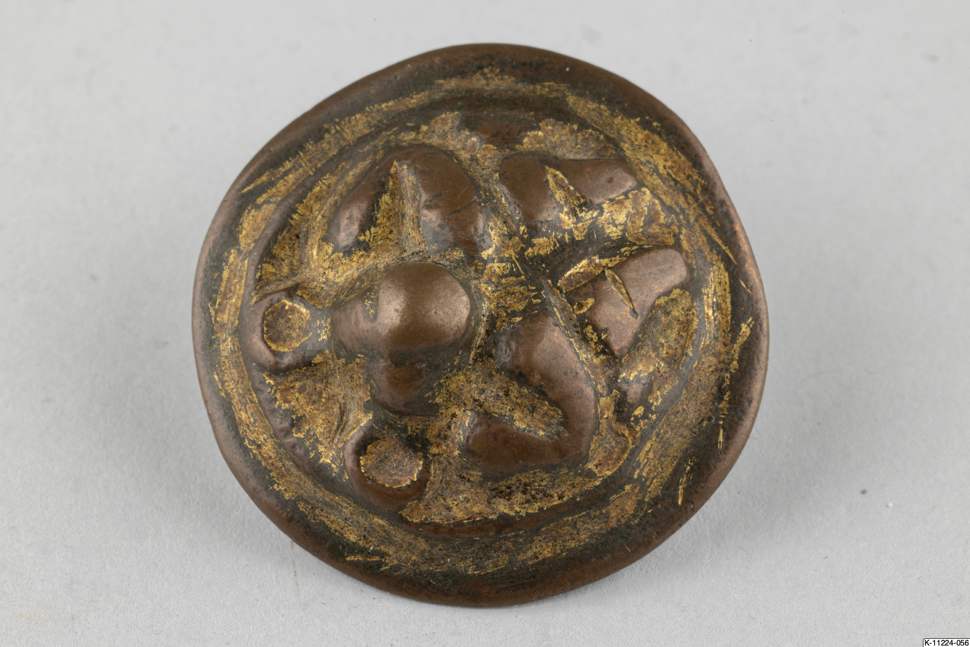 • Rund knapp med en björn som dekoration. Rester av förgyllning.