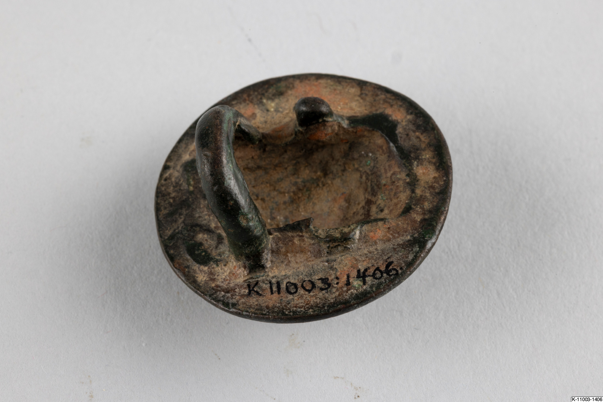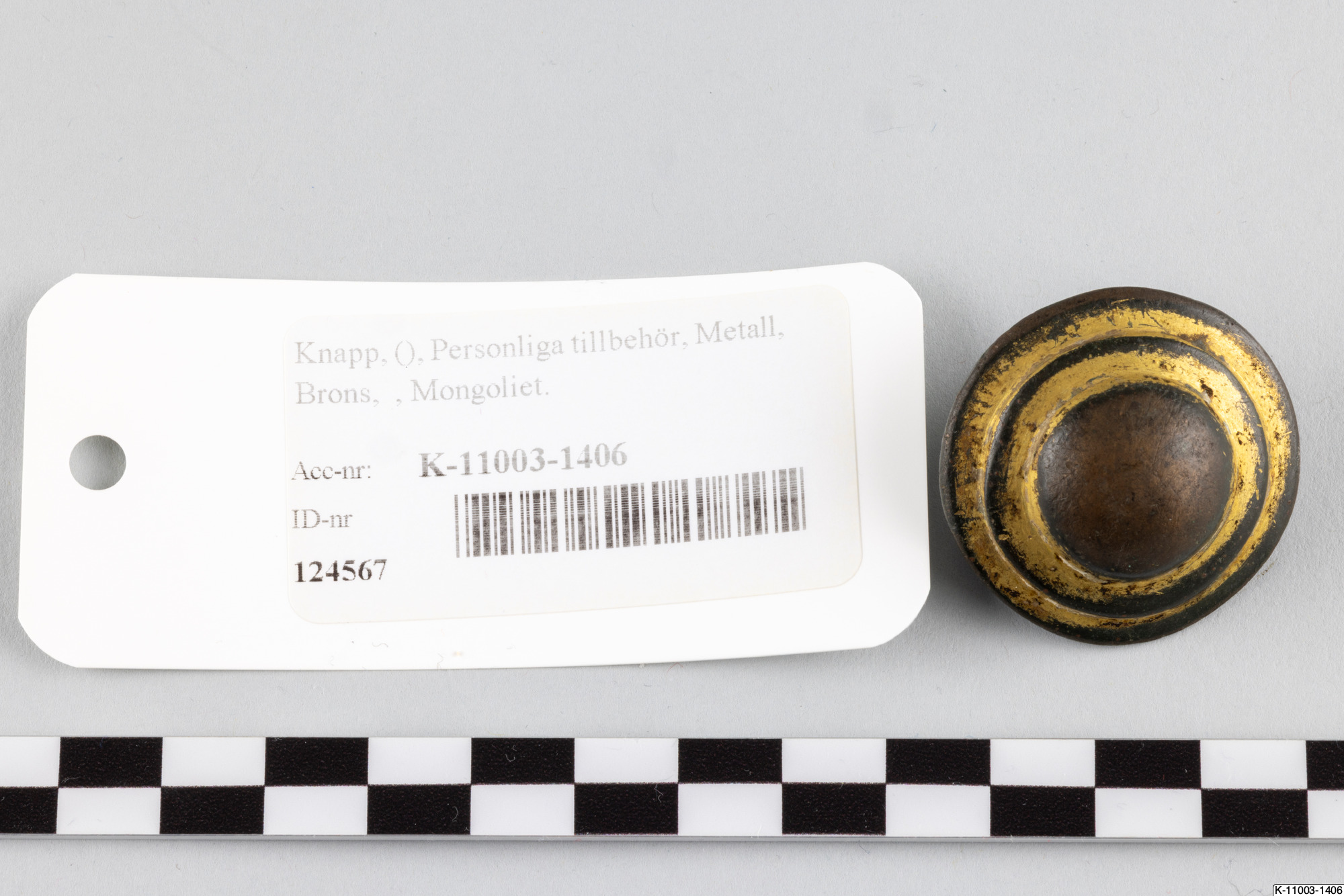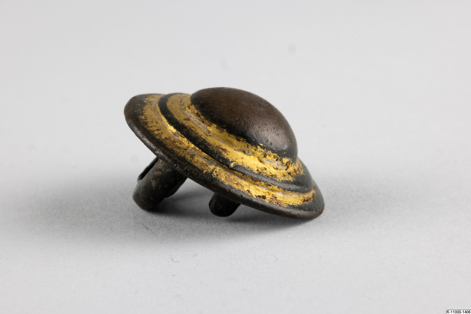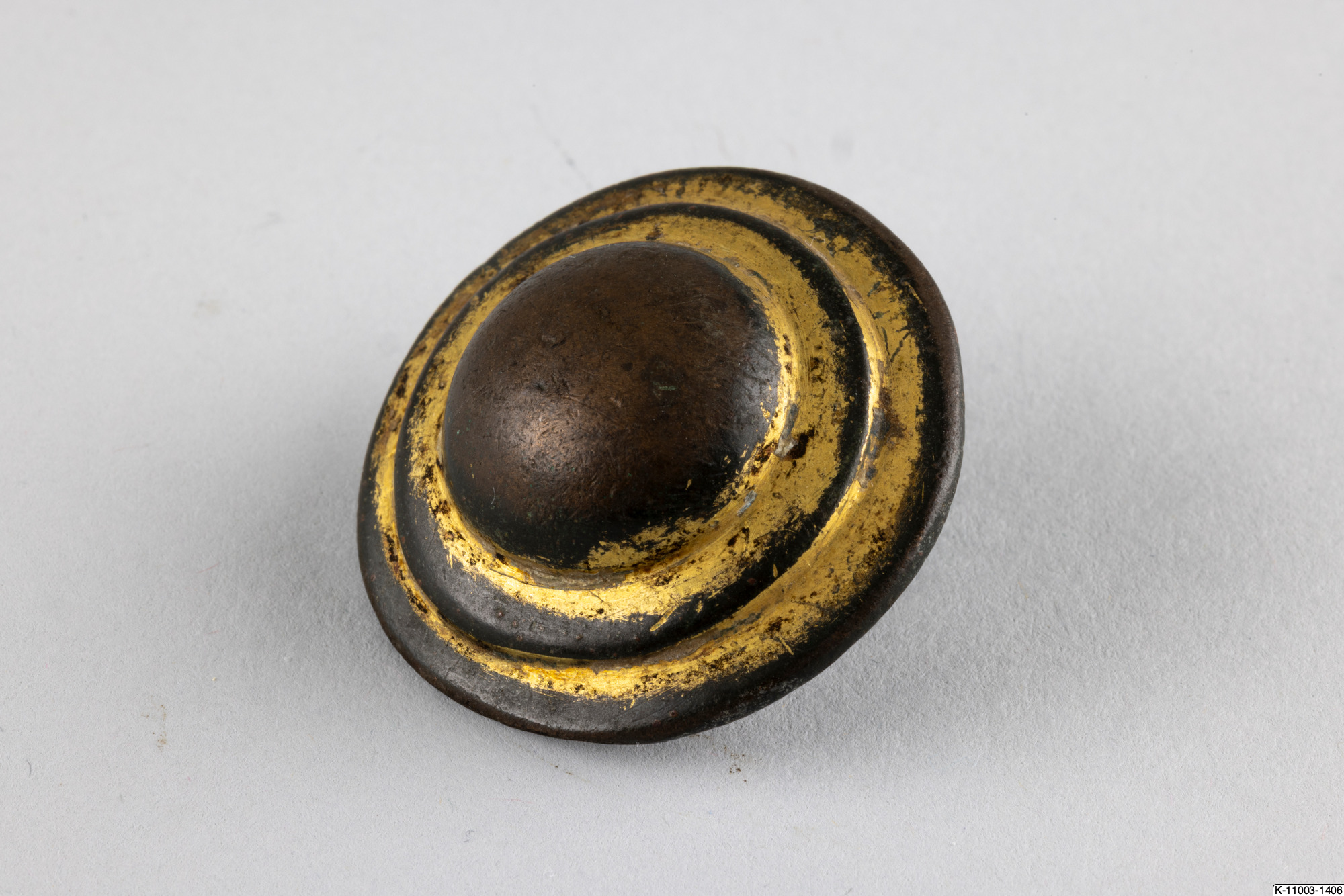 • Stor förgylld bronsknapp med en hel märla och en trasig på baksidan.
