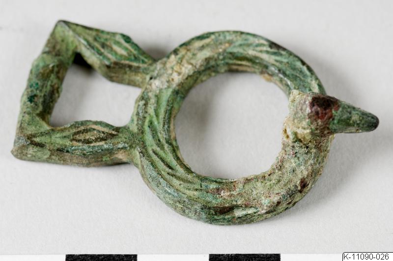 • Bältbuckla i form av ring, kantig ögla samt en hake. Dekorerad.