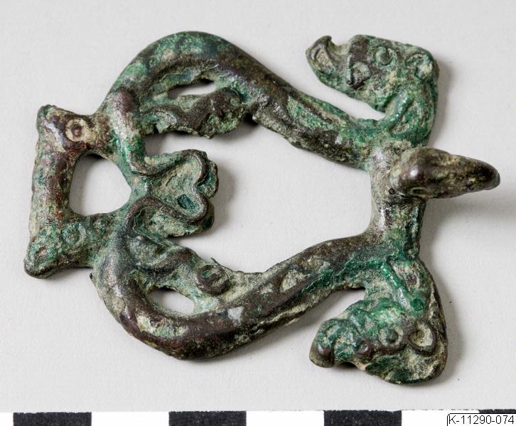 Bältbuckla bestående av två djur med ryggarna vända mot varandra och med kropparna böjda i S-form. Tillsammans bildar de en hjärtformad figur. Hake i form av fågelhuvud.