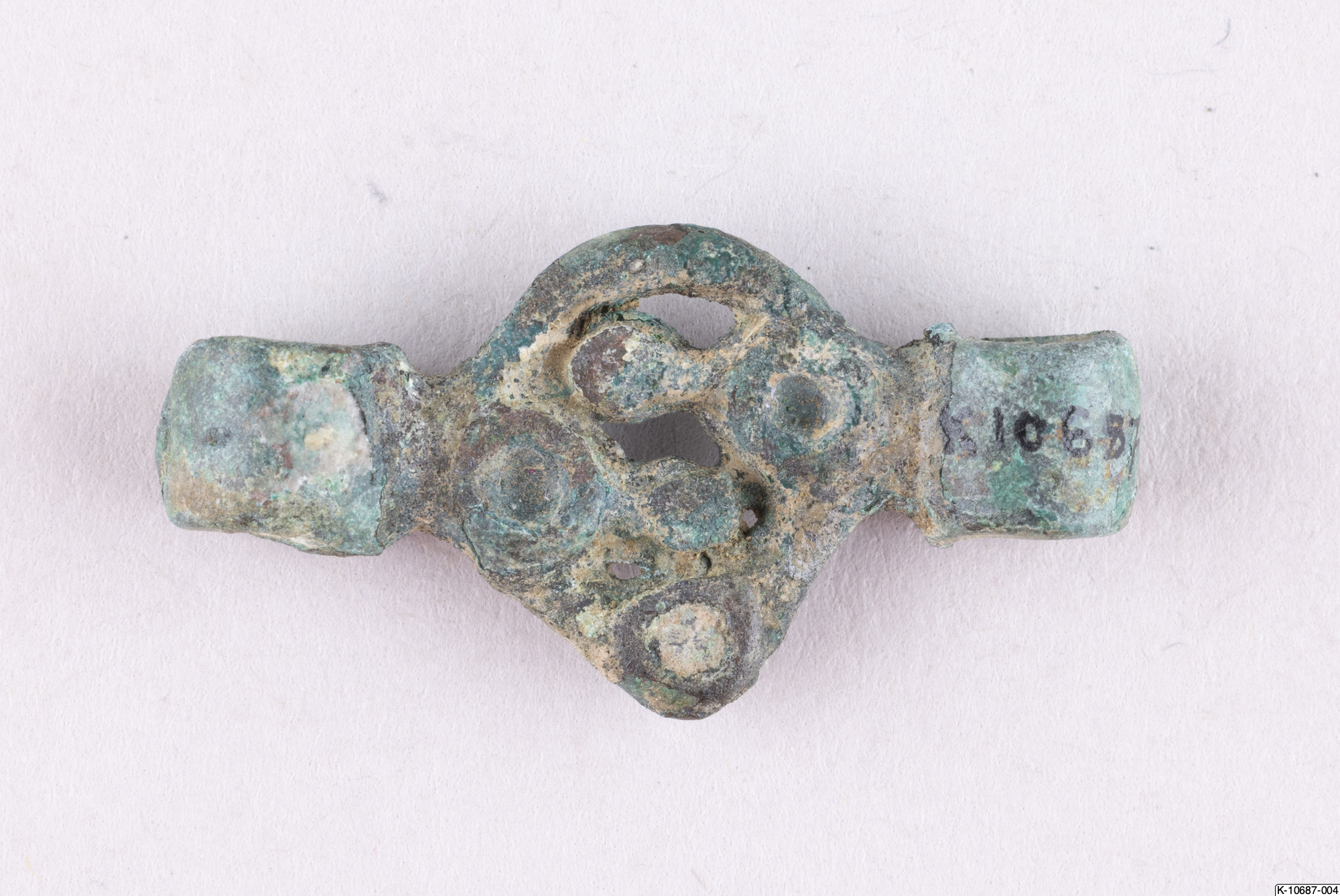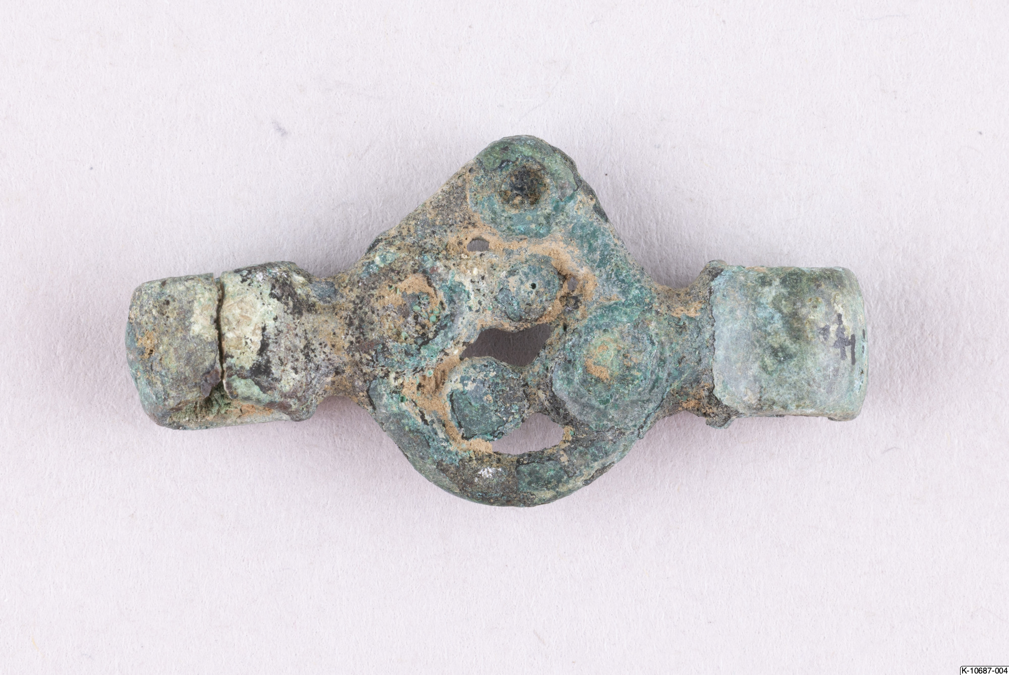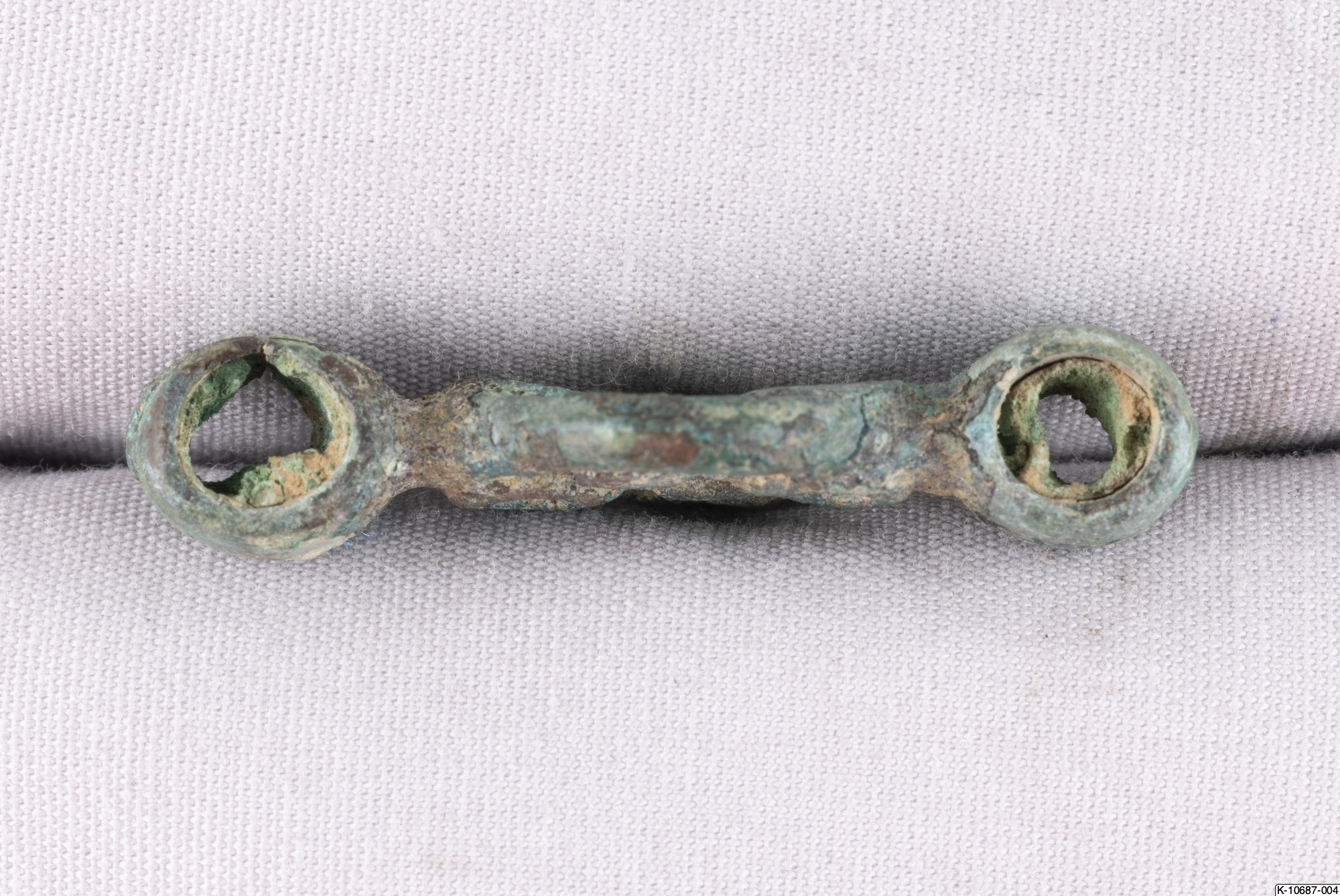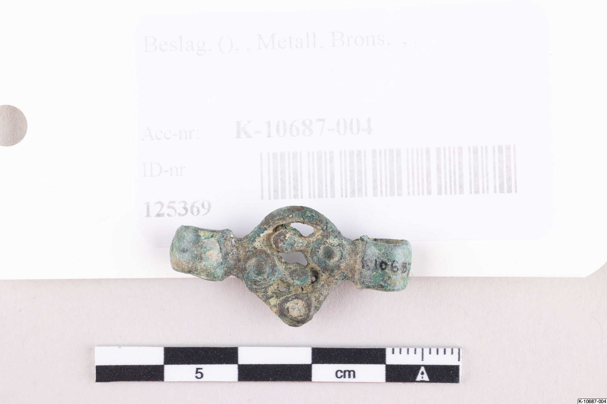 • Beslag eller länk till kedja bestående av liten rund genombruten skiva med en ögla på var sida.
