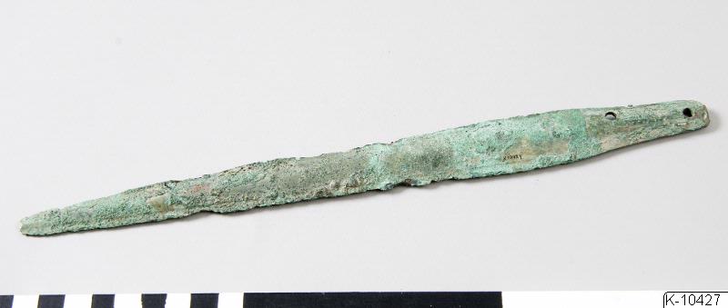 • Lansspets. Tånge med två nithål. Mycket ärgig.