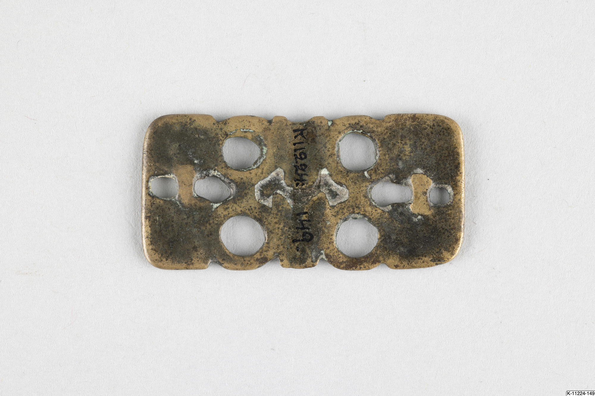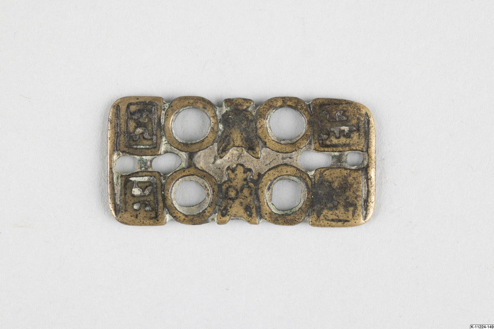 • Plakett, genombruten, rektangulär. Sliten yta.