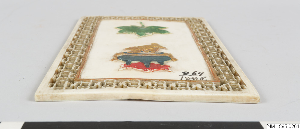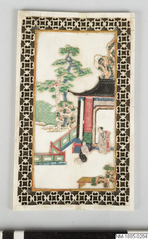 • Miniatyrskärn av elfenben. Genombryten dekor inramande graverat och polykromt motiv. Enlikt katalog ska denna skärm ha ett träställ.