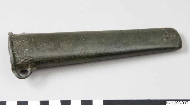 • Celt med holk, holkyxa. Lång och smal avsmalnande mot eggen. Två öglor nedanför holkmynningen, varav den ena defekt. Dekorerad upptill. Grön patina. Från nordvästra Kina.
