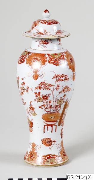 • Vas i långutsträckt form med lock. Dekor i blekrött och guld mot vitt: blommor och ornament.