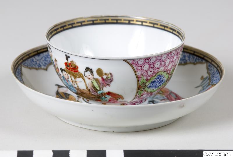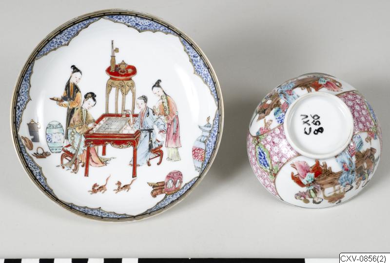 Längs med fatets innerkant löper en guldbård. I fatets centrala del är en scen avbildad där två personer sitter vid ett spelbord. Två personer står bredvid som åskådare, den ena håller i en bricka med två tekoppar på. Kopp: längs med dess innerkant löper en guldbård. I botten en ensam blomma i guld. På utsidan avbildas en scen med tre kvinnor som sitter vid ett bord.