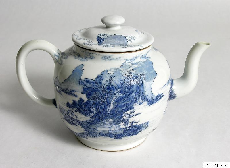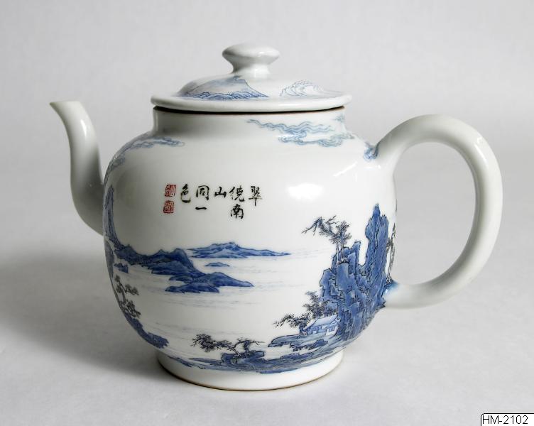 Tekanna. Porslin med landskapsdekor i blå emaljfärg. Lock i emalj på koppar, av senare datum Te-pot with landscape motif in underglaze blue. Märke och tid: Qing, Yongzheng-perioden (1723-35). Gustav VI Adolfs samling, Margot Holmes’ deposition. HM-2120