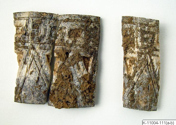 Fragment av ben, från Kina. Fragmentet består av tre delar, en a-märkt, en b-märkt, en utan märkning. De tre delarna har en gång suttit ihop och utgjort del av ett välvt föremål, dekorerat på utsidan med inskurna mönster. (Bearbetad då A-B-märkning togs bort ur accessionsnummerfältet/CR.)