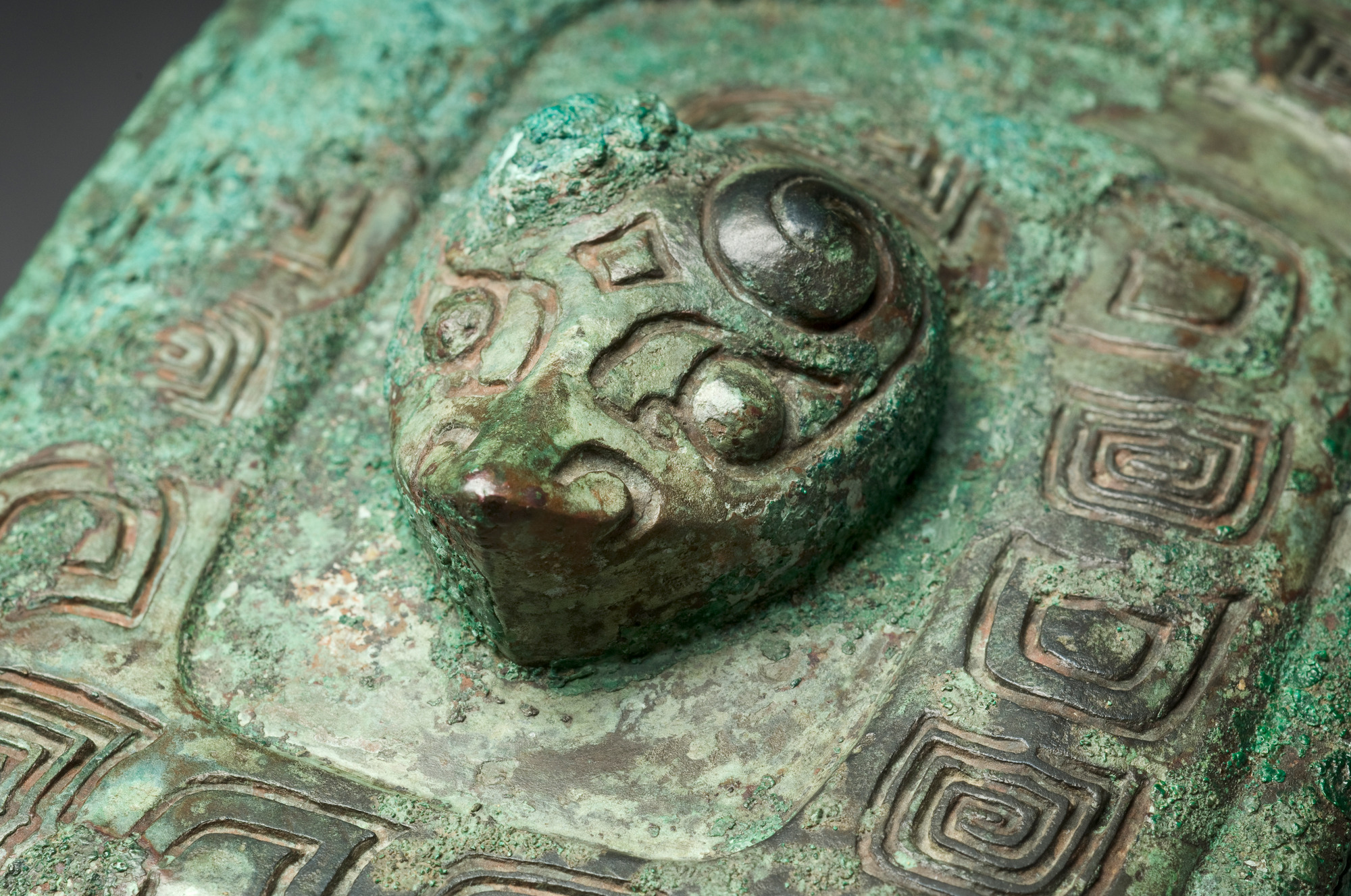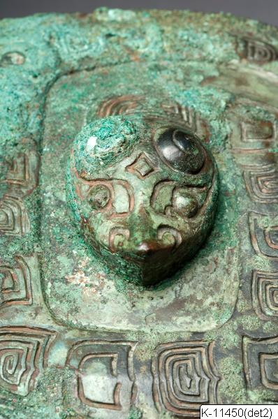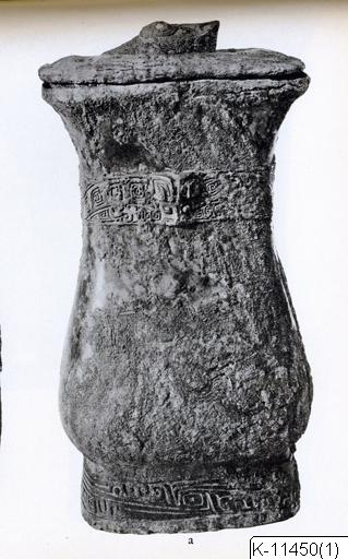 K-11450 Zhi - wine goblet, with lid, for sacrificial use. Bronze. S-formed profile. Square cross-section. Border of stylized dragons against a background of "cloud and thunder"-pattern (yunleiwen) around upper part of body. Attached animal head on in the middle of the border in the front and back. Around the foot band of cikada-like "cloud and thunder" pattern (xiejiao yunleiwen). On the lid scaled snake - the head sculptured in high relief. Classified by Karlgren as hu. Inscription (bottom of the goblet): Wei (four feet surrounding a circle). Shang, late Anyang period. Deep green patina with rusty brown splotches at the neck band.