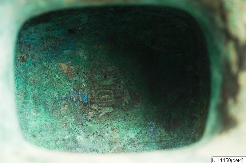 K-11450 Zhi - wine goblet, with lid, for sacrificial use. Bronze. S-formed profile. Square cross-section. Border of stylized dragons against a background of "cloud and thunder"-pattern (yunleiwen) ar...