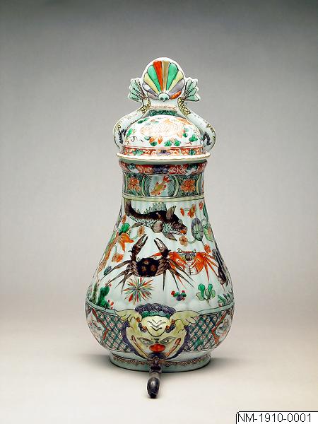 Vattencirstern / vattenfontän av porslin. Kinesiskt, daterad Kangxi (1662-1722). Balusterformad, bukig nertill och dekorativ ribbning. Dekor förestllande krabbot och fisk samt undervattenväxter. Vid kranen en dekortiv "mask". Locket kupigt samt prytt av en solfjäder omgiven av två delfinskärtar. Tillhör NM-1910-0002 (tillhörande kar).