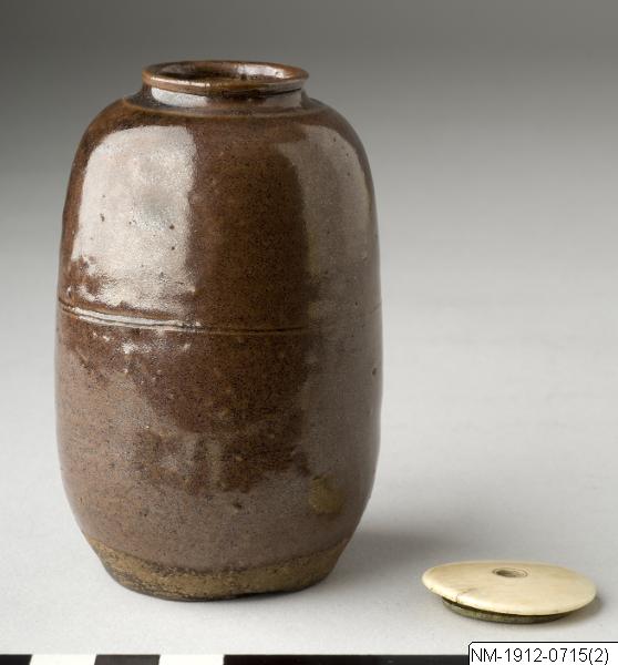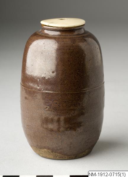 Tedosa med brun glasyr och lock av ben. I teceremonin används två huvudtyper av pulvriserat te som båda kommer från samma tebuske. Den ena typen kallas tjockt te (koicha) och används under den mer formella ceremonin och den andra kallas tunt te (usucha) för den mindre formella. Det tjocka teet anses något sötare och tillreds med mer pulver så konsistensen blir tjockare. Alla deltagare dricker ur samma teskål, medan det tunna teet serveras i varsin skål för varje deltagare. Olika tedosor används för de olika tetyperna. Generellt kallas dosor för tunt te för usucha-ki och är oftast av lackerat trä, medan tedosor för tjockt te brukar vara av keramik (chaire). Keramiktedosor importerades ursprungligen från Kina och Sydostasien, där de ofta hade använts för helt andra syften än teförvaring. Dosorna för tjockt te var framför allt före 1900-talet den högst rankade keramiktypen inom teceremonin, t o m före teskålar. Många tedosor klassades som ”berömda ting med poetiska namn” (meibutsu). Termen meibutsu började användas under Edo-perioden för att rangordna och klassificera kända föremål och bildkonst som utgör teceremonins materiella kulturarv.(Baserad på text från utställningskatalogen Japan. Föremål och bilder berättar. 2011). /PH