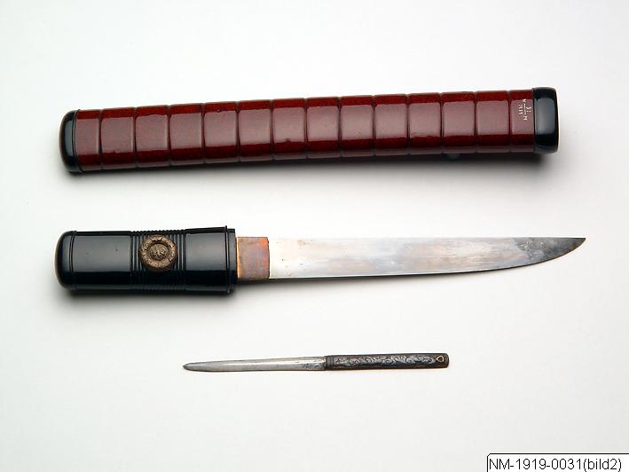 Dolk med handtag av svart lack, skida av räfflad mörkt röd lack. Kogai av järn. Menuki på handtaget. Liten kniv (kogatana) med dekor på skaftet (kotsuka).