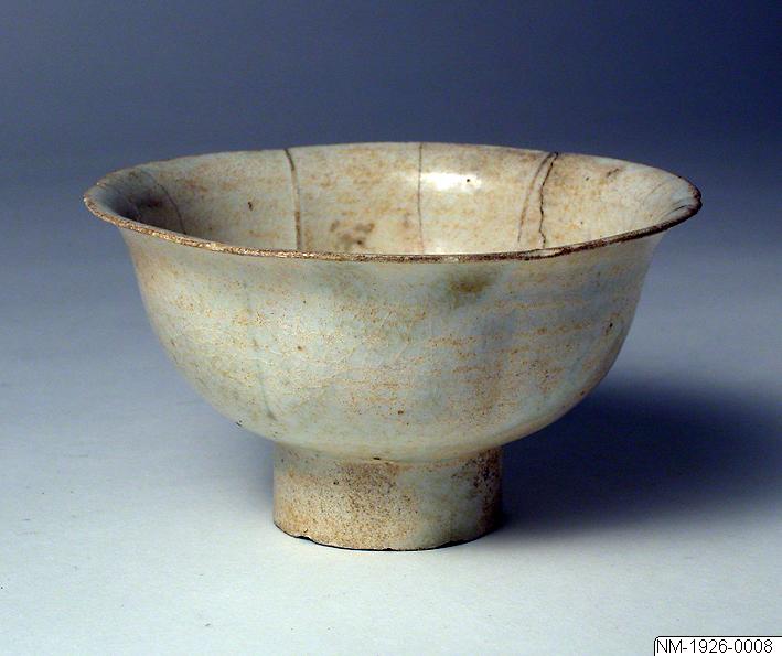Tekopp med lock / teskål med lock. Koppen / skålen har en hög fot och utvinklade kanter. Locket är till formen en skål med smal fot. Glasyren är blåaktigt vit och ljusblå. Kina. Song-dynastin, daterad ca 960 - 1279. Diameter 12,3 cm.