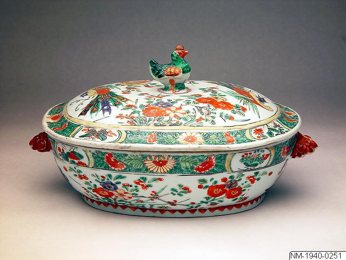 Terrin, serveringskål, med lock. Av porslin. Till formen oval, med låg fot, och öron / hantag på "kortsidan". Locket lätt välvt och knoppen formad som en fågel (tupp eller höna). Dekorerad med blommor och Fenghuang-fåglar i färgerna grönt, rött, gult, blått, aubergine (mörkt lila) samt guld. Runt terrinens ich lockets kant en bård med grön, mönstrad find och blommor i färg. Famille verte - "gröna familjen". Kina, 1662-1722. Möjligen exportporslin Längd 30,2 cm, bredd 21,9 cm, höjd (m. lock) 15,1 cm.
