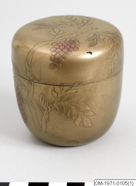 • Tea caddy (natsume) for thin tea with nanten plant (Nandina domestica) decoration. Probably 19th century. Gold lacquer on wood. Formerly in the collection of Charles de Champs (1873-1959). H 7 cm, Dia... Visa hela