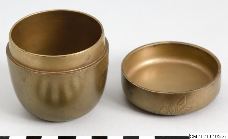• Tedosa (natsume) för tunt te (usucha) av lackerat trä, från Japan. Tedosan är lackerad i guldlack med blommotiv på dosa och lock, troligen växten nanten.