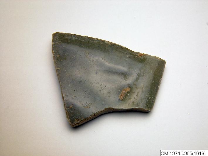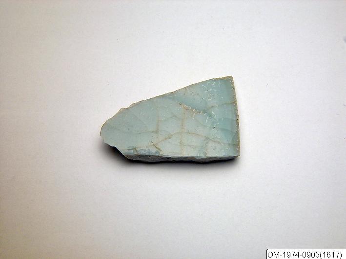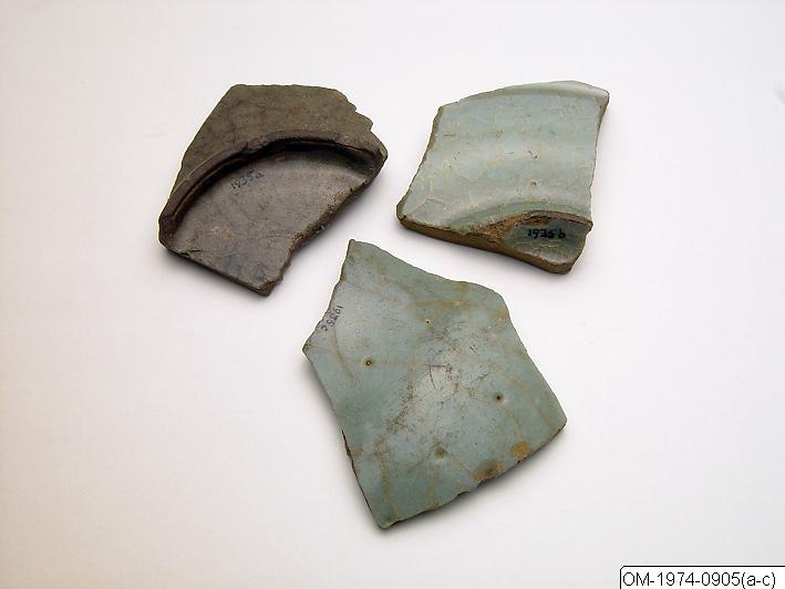 Ett antal skärvor. Enligt katalogkort:HM1935a-c: Tre stycken skärvor av Guan-vara från Hangzhou. Närmare tidsbestämning: Song HM1618: Skärva Material: Gråaktigt stengods med celadonglasyr. Tillverkningsort: Jinzuan (Chin Tsuan) HM1619: Skärva Material:Gråaktigt stengods med celadonglasyr. Tillverkningsort: Jinzuan (Chin Tsuan) HM1617: Skärva Material: Vitaktigt stengods med blåaktig celadonglasyr. Tillverkningsort: Jinzuan (Chin Tsuan) HM204: Rundslipad skärva av skål eller dyl. med ”fet”, ljusblå-violett-röd glasyr. Material: Mycket fint, gråaktigt stengods (kan möjligen anses som grovt porslin frågetecken) Tillverkningsort: Junzhou (Nuvarande Yuzhou) prov. Henan. HM205: Hjärtformigt slipad skärva av skål el. dyl. med ”fet”, nästan kristallis. glasyr. Material: Fint, grått stengods. Tillverkningsort: Junzhou (Nuvarande Yuzhou) prov. Henan. HM206: Rundslipad skärva av skål eller dyl. med ”fet”,blå ochviolett glasyr. Material: gråaktigt stengods Tillverkningsort: Junzhou (Nuvarande Yuzhou) prov. Henan. HM207: Oslipad skärva med blå och brun ”fet”glasyr och nummer på baksidan: färgprof. Material: Rödbrunt stengods. Tillverkningsort: Junzhou (Nuvarande Yuzhou) prov. Henan. HM208: Oslipad skärva med ljusblå, ”fet” glasyr och nummer på baksidan: färgprov. Material: ljusbrunt stengods. Tillverkningsort: Junzhou (Nuvarande Yuzhou) prov. Henan. HM209: Oslipad skärva med ljusblå ”fet” glasyr och nummer på baksidan: färgprof. Material: mörkbrunt stengods. Tillverkningsort: Junzhou (Nuvarande Yuzhou) prov. Henan. HM210: Oslipad skärva med ljusblå, ”fet” glasyr och nummer på baksidan: färgprov. Material: ljusgrått stengods. Tillverkningsort: Junzhou (Nuvarande Yuzhou) prov. Henan. HM1462: Fragment , bit av en hals av ett kärl. Material: Vitt porslin. Tillverkningsort: Kina, funnet 1934 i ruinerna av Istakr nära Persepolis. HM2229: Sidofragment av skål, Longquan celadon. Material: Stengods med grönblå glasyr över skuren lotusdekor. Tillverkningsort: Zhejiang, möjl. Dayao Närmare tidsbestämning: Song. HM1457: Skärva, botten av en skål. Material: Porslin grått celadonfärgad glasyr. Godset grått. Tillverkningsort: Yueyao. Zhejiang. HM1458: Skärva. Yueyao Material: Porslin grått celadonfärgad glasyr. Godset grått. Tillverkningsort: Yueyao. Zhejiang. HM1459: Skärva. Yueyao Material: Porslin grått celadonfärgad glasyr. Godset grått. Tillverkningsort: Yueyao. Zhejiang. HM1802: Tre skärvor med glasyr, två av dem med junglasyr, en med brun dito. Material: Grått stengods (2 st), vitt dito (1 st). Tillverkningsort: Skärvan med brunglasyr är från Zhaozi. HM1803: Skärva med gräddvit glasyr, Ding-typ. Material: Vitt stengods-porslin. HM2227: Bottenfragment av skål Qingbai (Yingqing) Material: Porslin täckt med ljusblå glasyr. Tillverkningsort: Trol. Jingdezhen. Funnen i Fonsfat. Närmare tidsbestämning: Song HM2228: Bottenfragment till skål, Yueyao. Material: Stengods med ljust olivfärgad glasyr. Tillverkningsort: Zhejiang, Funnen i Fonsfat. Närmare tidsbestämning: 900-tal.