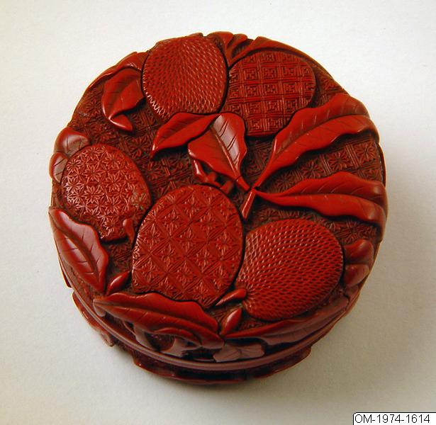 Chinese lacquer box and cover. Period: Late 15th century. Description: Small round box carved in red lacquer. Straight sides and flat cover. Design of li-chih fruits and leaves. Inside black lacquered. Measures: D 73mm. Purchased: Bequest of H.M. King Gustaf VI Adolf. No 1637. Dossier: TOCS, Vol. 30, pl. 61, No 246. J Wirgin: BMFEA 44/1972, pls. 21a, 22a. Expo: USA 1966, Stockholm 1967, No 125; BM, London 1972, No 158. engelska