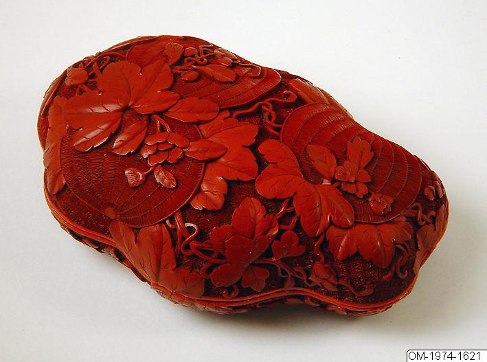Ask med lock av rödlackerat trä, från Kina. Asken har oregelbunden form och är dekorerad med skurna mönster i djup relief föreställande meloner och växt-motiv. Enligt katalogkort: “ Chinese lacquer box and cover. Period: Ch’ing, Ch’ien-lung. Description: Asymmetric oval in shape, of red carved lacquer. Decorated with melons and leave scrolls. Interior black lacquered. Measures: L. 140 mm. Purchased: Bequest of H.M. King Gustaf VI Adolf. No 1921.” Enligt HM-kort: Ask, osymmetrisk med reliefdekor av meloner. Material: Rött, skuret lack utvändigt, svart lack invändigt. Närmare tidsbestämning: Qianlong.