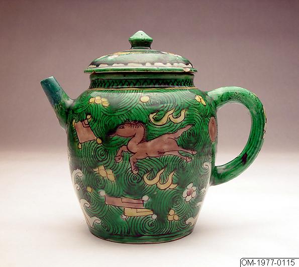 Tekanna med dekor av hästar och plommonblommor mot vågmönster. Porslin med emaljfärgsdekor Tea pot. Porcelain decorated with enamel colours Ming, 1500-talet. Axel och Nora Lundgrens samling. OM-1977-...