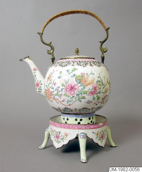 Tekök på retuchad på fyra ben, emalj och koppar, famille rose. Qing-dynastin, Qianling 1735-1796 Gåva av Estrid Erikson. ÖM-1982-56