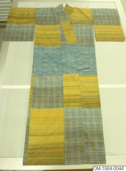 Kimono i tsumugi-siden (råsiden). Shimura Fukumi (f 1924) Blogginlägg av Japan-intendent Petra Holmberg 2015: http://samlingar.varldskulturmuseerna.se/levande-farg-kimono-konst-av-fukumi-shimura/ Kimono Kimono betyder ”något att ha på sig” och är samlingsnamnet på ett centralt plagg för både män och kvinnor, unga och gamla. Ordet kimono började användas på 1700-talet, enligt andra källor sent 1800-tal. Vanligt är specialtermer för specifika plagg, som för kimonon med liten ärmöppning vid handleden (kosode) eller avslappnat vardagliga bomullskimono (yukata). Man skiljer även på ”inhemsk klädsel” (wafuku) och västerländskt påverkad (yofuku). Tillskärningen är tekniskt enkel. En rulle på mellan tio och tolv meter med tygbredd ca 36 cm behövs till ett plagg. Tyget används ofta som en yta för broderi- och färgningstekniker utöver vävningen som dekorationsteknik. Kimonon är som de flesta kläder föränderlig och har varierande visuella uttryck under tidens gång. Kimonon är starkt betydelsebärande. Ur varje element, som ärmarnas utformning, hur den bärs, vilka färger och mönster den har, vilket material den är gjord av, kan man utläsa något viktigt. Dam- och herrknäppning existerar inte. Historiskt sett stänger alla kimonon till höger, enbart på avlidna personer läggs den med omlott åt vänster. Kimonons rötter finns främst i Kina, men även i Korea. Tidiga exempel på avbildningar av människors utseende är gravfiguriner (haniwa) i lergods från Kofun-perioden (ca 300–538 e v t). Under Heian-perioden (794–1185) använde hoivet underplagg som liknade kimonon under sina lager med vida dräkter (uchigi eller junihitoe). De som kroppsarbetade, t ex hantverkare och bönder, bar också kimonoliknande plagg (bl a happi). Under Muromachi-perioden (1392–1573) började kimonon slå igenom brett. I och med detta blev Japan också ett av de mest framträdande modeländerna i världen. Detta accentuerades under Edo-perioden, särskilt genom den växande stadsbefolkningen. Efter en period av androgynitet i klädseln framträdde under 1700-talet tydligare skillnader mellan vuxna mäns och kvinnors klädsel. Under 1600-talet uppstod ett mode med breda ärmar (furisode) för unga ogifta kvinnor, som hade rötter i barns klädsel 300 år tidigare. Den extra vidden på ärmen ansågs charmig och det kunde senare för unga kvinnor vara en del i flirten att svänga med ärmarna. När bältet (obi) blev bredare växte även ärmarna och nådde sin maximala bredd under andra hälften av 1700-talet. Medan stadsbornas (chonin) kvinnor använde furisode vid högtidliga tillfällen kunde döttrar till länsherrar och förmögna köpmän använda plagget till vardags. Även kvinnliga underhållare, t ex geishor, och prostituerade bar furisode. (Baserad på text från utställningskatalogen Japan. Föremål och bilder berättar. 2011). /PH