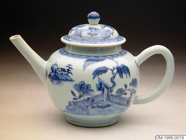 Tekanna, globulär,med rak pip, kort hals, handtag av rundad form och konvext lock med rund knopp. Porslin med dekor i underglasyrblått av flodbrädd och terrass med trädgårdsklippa,pilträdoch blommor omgiven av staket, samt en ö med ett hus omgivet av nakna träd på andra sidan floden. Nedanför halsen bård med rutmönster. Locket dekorerat med terrassmotivet samt en bård med rutmönster. Knoppen intehelt täckt med glasyr. (Från skeppet Geldermalsen, utgrävd av Hatcher's expedition. (Christie's Amsterdamaukt. -86, lot 2169)).