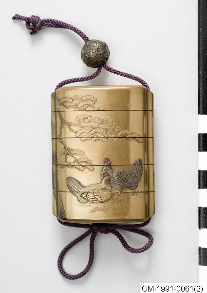 Föremålet märkt A-B. ÖM 1991: 061 a: Fyrdelad inro i guldlack i låg relief (hiramaki-e) med röda, gråa och svarta accenter. Dekor av tupp sittande på drakprydd trumma samt stiliserad tall och plommonblommor på den ena sidan. Trumman vilar på ett blanksvart ställ och har träådringsimitation och dess framsida är gråaktig. Tuppen har färgaccenter i rött på huvudet och svart på stjärtfjädrarna. Plommonblommorna är röda. Inro har genomgående guldgrund (kinji). Den andra sidan visar två hönor med röda detaljer under tallen. Insidan i nashiji. nrô, fyrdelad, med kinji-grund och dekor av en tupp sittande på en trumma (på ena sidan) och två hönor (på andra sidan). Motivet, som symboliserande fred och lycka i landet, är utfört i hiramaki-e med detaljer i silver, rött och svart lack. En tallstam reser sig längs sidan av inrôn och dess grenar sträcker ut sig på både fram- och baksidorna. Trumman är föreställd som gjord av fint ådrat trä och dess slagsida (i fundame) är dekorerad med en drake. Den vilar på ett svart lackställ och är överväxt med murgröna som skiftar i rött. Signerad "Kajikawa saku" (skapad av Kajikawa) i guldlack hiramaki-e på undersidan. Insidan i nashiji. ÖM 1991: 061b: Ojime i form av metallkula med dekor av fenixfågel bland moln. Symbolik: tupp på trumma (kanko dori) innebär fred, enligt en gammal kinesisk historia, då en sammankallande trumma stod utanför huvudpalatset. Men under kejsar Yao rådde fred så länge att trumman blev stående utan att brukas och i stället blev den mest föredragna viloplatsen för tuppar. En annan version på temat talar om hur den japanske kejsare Kotokus (600-talet) palatstrumma kunde slås på av allmänheten närhelst de ville framföra klagomål. Eftersom kejsaren regerade så vist hade ingen skäl att använda trumman, utan tuppar utnyttjade den som sittplats, därmed pekande på freden och lyckan i landet./PH (Bearbetad då A-B-märkningen togs bort ur accessionsnummerfältet/CR.) Kimonon har inga fickor, småsaker kunde läggas i ärmarna och innan för bältet och så kunde man bära olika dosor, pipor och penselfodral på en snodd från bältet. De bärbara sakerna kallas sagemono. Accessoarerna blev särskilt för männen identitetsskapande statusföremål och en viktig del av herrmodet, en egen värld i mindre skala med rika motiv. Olika typer av konstnärligt utformade sagemono är kända fr o m 1600-talet. Förutom tobaksrelaterade dosor är en av de mer kända typerna sigilldosor (inro). Bokstavlig betydelse är en korg (ro) att lägga sigill (in) i. Enligt lag var endast stämplade signaturer giltiga vilket krävde att t ex samurajer och köpmän som hade behov av sigillstämplar fick bära dem med sig i små dosor. Detta var ursprunget till sigilldosor (inro) som snart främst kom att användas för medicinförvaring. Utseendet på accessoarerna varierade efter bärarens smak, ekonomi och modetrender. När västerländsk klädsel med fickor blev populär under Meiji-perioden (1868-1912) minskade behovet av dessa bärbara föremål och de delades ibland upp i sina beståndsdelar (netsuke, s k bältesknappar) för sig och såldes till västerlänningar. (Baserad på text från utställningskatalogen Japan. Föremål och bilder berättar. 2011). Miniatyrskulpturerna, ofta kallade bältesknappar, (netsuke) rymmer en hel värld att utforska. Myter är ett stort motiv. Ofta var designen skyddande, lyckobringande och inte minst underhållande. Netsuke-föremålets funktion består i att vara en motvikt till de "hängande saker" (sagemono) som bars till kimonon av männen. Vanliga hängande saker var olika dosor, till exempel medicindosor (inro) och tobakspungar. Netsuke betyder ungefär "fästa rot" och tidiga netsuke (före sent 1600-tal) var förmodligen naturliga, obearbetade rötter och liknande. Från 1700-talet gjordes de mer föreställande och ofta i trä eller elfenben. Så småningom började konstnärerna att signera sina netsuke. (Baserad på text från utställningen Japan. Föremål och bilder berättar. 2011)./PH Lack: teknik och funktion Den japanska lacken kommer från lackträdet (Rhus verniciflua/vernicifera) som är släkt med mango och cashewnöt i familjen sumakväxter. Det finns flera besläktade lackträd som kan ge lack. Trädet tappas på sin sav ungefär som när man tappar gummi. Efter tappning dör trädet. Saven filtreras och är i sin flytande form eksemframkallande. Den är nästan ofärgad. Genom pigment färgas lacken, t ex svart (med järnoxid) eller röd (från kvicksilver). Lackens funktionella betydelse ligger i att den skyddar underlaget. Vanliga underlag är trä, men även metall, textil, papper och keramik. Lackeringen består ofta av ett 50-tal faser och börjar med grundning, en blandning av lack, bränt lerpulver och stenpulver. Sedan följer slipning. Själva lackeringen sker ofta i flera lager. Varje lager behöver härda i ett dammfritt skåp med ca 80% luftfuktighet. Polering är också ett viktigt moment. Tidsåtgången för ett exklusivt lackföremål kan vara upp till tio år. Vanliga dekorationstekniker är inlägg av bl a pärlemor samt pulveriserade metaller (maki-e). Lacken användes på t ex rustningar och under andra världskriget som rostförebyggare på vapen. Guldlack används även vid lagning av keramikföremål, där det icke-perfekta sätts i fokus genom lacket som en medveten del i estetiken. Hantverk: exemplet lacktillverkning De största lackproducerande områdena idag är Tokyo (Edo-lack), Kyoto (Kyo-lack) och Kanazawa (Kaga-lack). Andra viktiga platser för lacktillverkning med lång historia är Wajima, Takayama och Takamatsu. Lackarbeten har använts i Japan som konstföremål och vardagsföremål åtminstone sedan mitten av Jomon-perioden (ca 10500–300 f v t). Nya fynd kan troligen dateras till ca 7000 år f v t. Omkring 586 e v t startade en lackavdelning inom finansministeriet för att effektivt kunna o