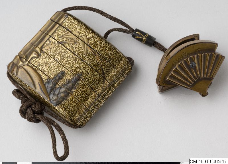 Inro with decoration of bamboo, ojime in metal (no-theatre mask) and netsuke (a box with lid) in the shape of a fan. Gold lacquer. The kimono having no pockets, accessories have to be carried somehow. Women could put small objects in their sleeves and sash, whereas men, mainly, would hang their various boxes, pipes and brush cases on a cord at their belt. The portable objects are called sagemono. Accessories became identity-forming status objects and an important part of men´s fashion, a world in miniature with a wealth of subjects. Various kinds of artistically crafted sagemono are known from the 17th century. In addition to boxes for tobacco, cases for personal seals (inro) are one of the best-known types. Literally translated, an inro is a basket (ro) containing a seal (in). Only sealed signatures were legally valid, and so samurai and merchants, for example, needing seal stamps had to carry them in small cases. This was the origin of “seal baskets” (inro), which soon came to be used primarily for carrying medicine. These accessories varied in appearance according to the wearer’s taste and wealth, as well as fashion trends. When Western dress became popular during the Meiji period (1868-1912), there was less need for these portable objects, and they were divided up into their constituent parts (with toggles kept apart) and sold to westerners. (Based on the text for the exhibition catalogue Japan. Artefacts and images tell the story. 2011). The function of the netsuke item is to be a counterweight to the "hanging things" (sagemono) worn with the kimono by the men. Common hanging items were various boxes, for example medicine boxes (inro) and tobacco pouches. Netsuke roughly means "fixed root" and early netsuke (before the late 17th century) were probably natural, unprocessed roots and the like. From the 18th century they were made more representative and often in wood or ivory. Eventually, the artists began to sign their netsuke. (Based on the text for the exhibition Japan. Artefacts and images tell the story. 2011).