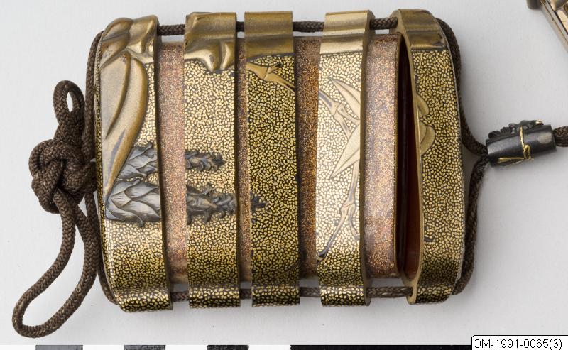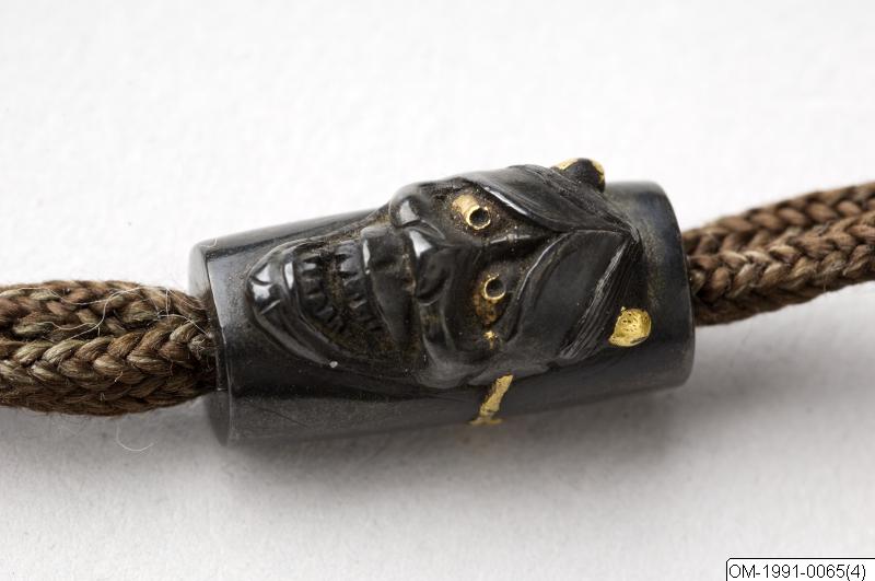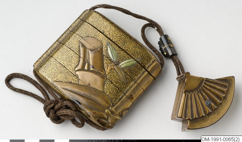 Föremålet märkt A-B. A: Inrô, fyrdelad, med okihirame- grund och dekor av en del av en bambustam med löv i guldlack i takamakie . De två genomskinliga och inristade skotten och de två gulgröna löven (antagligen färgade med kromoxid) är gjorda av inlagt horn. Insidan i nashiji. B: Ojime av shakudô (legering av koppar och guld) i form av en cylinder med påbunden nô-mask föreställande en kvinnlig demon. Maskens horn, ögon och fästsnören är förgyllda. (Bearbetad då A-B-märkningen togs bort ur accessionsnummerfältet/CR.) Kimonon har inga fickor, småsaker kunde läggas i ärmarna och innan för bältet och så kunde man bära olika dosor, pipor och penselfodral på en snodd från bältet. De bärbara sakerna kallas sagemono. Accessoarerna blev särskilt för männen identitetsskapande statusföremål och en viktig del av herrmodet, en egen värld i mindre skala med rika motiv. Olika typer av konstnärligt utformade sagemono är kända fr o m 1600-talet. Förutom tobaksrelaterade dosor är en av de mer kända typerna sigilldosor (inro). Bokstavlig betydelse är en korg (ro) att lägga sigill (in) i. Enligt lag var endast stämplade signaturer giltiga vilket krävde att t ex samurajer och köpmän som hade behov av sigillstämplar fick bära dem med sig i små dosor. Detta var ursprunget till sigilldosor (inro) som snart främst kom att användas för medicinförvaring. Utseendet på accessoarerna varierade efter bärarens smak, ekonomi och modetrender. När västerländsk klädsel med fickor blev populär under Meiji-perioden (1868-1912) minskade behovet av dessa bärbara föremål och de delades ibland upp i sina beståndsdelar (netsuke, s k bältesknappar) för sig och såldes till västerlänningar. (Baserad på text från utställningskatalogen Japan. Föremål och bilder berättar. 2011). Miniatyrskulpturerna, ofta kallade bältesknappar, (netsuke) rymmer en hel värld att utforska. Myter är ett stort motiv. Ofta var designen skyddande, lyckobringande och inte minst underhållande. Netsuke-föremålets funktion består i att vara en motvikt till de "hängande saker" (sagemono) som bars till kimonon av männen. Vanliga hängande saker var olika dosor, till exempel medicindosor (inro) och tobakspungar. Netsuke betyder ungefär "fästa rot" och tidiga netsuke (före sent 1600-tal) var förmodligen naturliga, obearbetade rötter och liknande. Från 1700-talet gjordes de mer föreställande och ofta i trä eller elfenben. Så småningom började konstnärerna att signera sina netsuke. (Baserad på text från utställningen Japan. Föremål och bilder berättar. 2011)./PH Lack: teknik och funktion Den japanska lacken kommer från lackträdet (Rhus verniciflua/vernicifera) som är släkt med mango och cashewnöt i familjen sumakväxter. Det finns flera besläktade lackträd som kan ge lack. Trädet tappas på sin sav ungefär som när man tappar gummi. Efter tappning dör trädet. Saven filtreras och är i sin flytande form eksemframkallande. Den är nästan ofärgad. Genom pigment färgas lacken, t ex svart (med järnoxid) eller röd (från kvicksilver). Lackens funktionella betydelse ligger i att den skyddar underlaget. Vanliga underlag är trä, men även metall, textil, papper och keramik. Lackeringen består ofta av ett 50-tal faser och börjar med grundning, en blandning av lack, bränt lerpulver och stenpulver. Sedan följer slipning. Själva lackeringen sker ofta i flera lager. Varje lager behöver härda i ett dammfritt skåp med ca 80% luftfuktighet. Polering är också ett viktigt moment. Tidsåtgången för ett exklusivt lackföremål kan vara upp till tio år. Vanliga dekorationstekniker är inlägg av bl a pärlemor samt pulveriserade metaller (maki-e). Lacken användes på t ex rustningar och under andra världskriget som rostförebyggare på vapen. Guldlack används även vid lagning av keramikföremål, där det icke-perfekta sätts i fokus genom lacket som en medveten del i estetiken. Hantverk: exemplet lacktillverkning De största lackproducerande områdena idag är Tokyo (Edo-lack), Kyoto (Kyo-lack) och Kanazawa (Kaga-lack). Andra viktiga platser för lacktillverkning med lång historia är Wajima, Takayama och Takamatsu. Lackarbeten har använts i Japan som konstföremål och vardagsföremål åtminstone sedan mitten av Jomon-perioden (ca 10500–300 f v t). Nya fynd kan troligen dateras till ca 7000 år f v t. Omkring 586 e v t startade en lackavdelning inom finansministeriet för att effektivt kunna organisera lackproduktionen. Buddismen kom till landet under samma tid och man började göra religiöst relaterade föremål som skulpturer och tempelinredningar. Användning av pulvriserade metaller är belagd från 700-talet, bl a i form av ”strödd bild” (maki-e) som anses unikt japansk. I Heian-periodens (794–1185) mest berömda berättelse, Genji monogatari, nämns rikt dekorerad lackinredning och lackföremål. Under Edo-perioden räknades lackträdet som ett av de ”fyra viktiga träden” tillsammans med tebusken, mullbärsträdet som man gör papper av (Broussonetia papyrifera) och mullbärsträdet som man matar silkeslarver med (Morus alba). Lackråvaran användes t ex som skattebetalning. Under Edo-periodens mitt började även förmögna handelsmän beställa exklusiva lacker med guld och pärlemorinläggningar. Lackföremålens stora betydelse i Japan jämförs med bruket av porslin i Kina. När européerna kom till Japan i mitten av 1500-talet blev de fascinerade av lackerna. Lacker var hett eftertraktade och gick på export till Europa, särskilt den typ som kallas namban-lack, som ofta har pärlemorinläggningar. Européerna försökte också att imitera den japanska lacken utan större framgång (”japanning”). Under 1900-talet har flera åtgärder vidtagits för att både bevara och kreativt utveckla lackkonsten. (Baserad på text från utställningskatalogen Japan. Föremål och bilder berättar. 2011). /PH