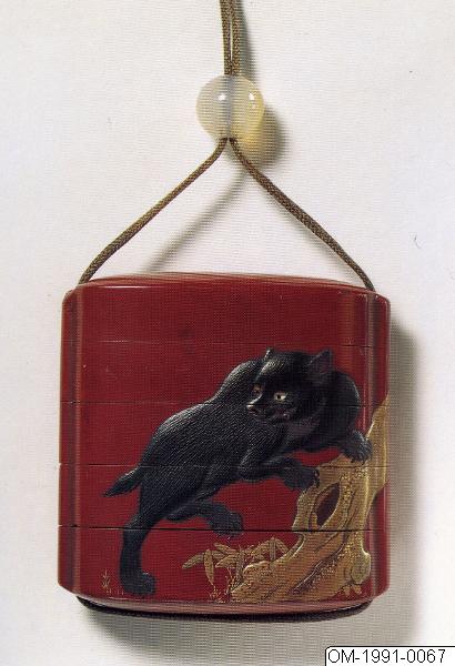 Föremålet märkt A-B. A: Inrô, fyrdelad, i röd lackgrund, shu urushi , med dekor utfört i svart takamakie samt guldlack takamakie och hiramakie som föreställer en björn (tsukinowaguma) klättrande på en tallstam (på ena sidan) och en stor hängande gren med barr (på andra sidan). Djurets fina pälshår, klara (genomskinliga) ögon med svarta pupiller, skarpa tänder, hängande tunga, och kraftiga klor är noggrant återgivna. Vid marken växer bambu. Trädstammen och grenen har textur genom kirigane; vissa smågrenar och de två kottarna är utförda i brunt lack. Insidan i nashiji. B: Ojime av agat (halvgenomskinlig gråvit sten med strimma i gult), i form av en pärla. (Bearbetad då A-B-märkningen togs bort ur accessionsnummerfältet/CR.) Kimonon har inga fickor, småsaker kunde läggas i ärmarna och innan för bältet och så kunde man bära olika dosor, pipor och penselfodral på en snodd från bältet. De bärbara sakerna kallas sagemono. Accessoarerna blev särskilt för männen identitetsskapande statusföremål och en viktig del av herrmodet, en egen värld i mindre skala med rika motiv. Olika typer av konstnärligt utformade sagemono är kända fr o m 1600-talet. Förutom tobaksrelaterade dosor är en av de mer kända typerna sigilldosor (inro). Bokstavlig betydelse är en korg (ro) att lägga sigill (in) i. Enligt lag var endast stämplade signaturer giltiga vilket krävde att t ex samurajer och köpmän som hade behov av sigillstämplar fick bära dem med sig i små dosor. Detta var ursprunget till sigilldosor (inro) som snart främst kom att användas för medicinförvaring. Utseendet på accessoarerna varierade efter bärarens smak, ekonomi och modetrender. När västerländsk klädsel med fickor blev populär under Meiji-perioden (1868-1912) minskade behovet av dessa bärbara föremål och de delades ibland upp i sina beståndsdelar (netsuke, s k bältesknappar) för sig och såldes till västerlänningar. (Baserad på text från utställningskatalogen Japan. Föremål och bilder berättar. 2011). Miniatyrskulpturerna, ofta kallade bältesknappar, (netsuke) rymmer en hel värld att utforska. Myter är ett stort motiv. Ofta var designen skyddande, lyckobringande och inte minst underhållande. Netsuke-föremålets funktion består i att vara en motvikt till de "hängande saker" (sagemono) som bars till kimonon av männen. Vanliga hängande saker var olika dosor, till exempel medicindosor (inro) och tobakspungar. Netsuke betyder ungefär "fästa rot" och tidiga netsuke (före sent 1600-tal) var förmodligen naturliga, obearbetade rötter och liknande. Från 1700-talet gjordes de mer föreställande och ofta i trä eller elfenben. Så småningom började konstnärerna att signera sina netsuke. (Baserad på text från utställningen Japan. Föremål och bilder berättar. 2011). /PH Lack: teknik och funktion Den japanska lacken kommer från lackträdet (Rhus verniciflua/vernicifera) som är släkt med mango och cashewnöt i familjen sumakväxter. Det finns flera besläktade lackträd som kan ge lack. Trädet tappas på sin sav ungefär som när man tappar gummi. Efter tappning dör trädet. Saven filtreras och är i sin flytande form eksemframkallande. Den är nästan ofärgad. Genom pigment färgas lacken, t ex svart (med järnoxid) eller röd (från kvicksilver). Lackens funktionella betydelse ligger i att den skyddar underlaget. Vanliga underlag är trä, men även metall, textil, papper och keramik. Lackeringen består ofta av ett 50-tal faser och börjar med grundning, en blandning av lack, bränt lerpulver och stenpulver. Sedan följer slipning. Själva lackeringen sker ofta i flera lager. Varje lager behöver härda i ett dammfritt skåp med ca 80% luftfuktighet. Polering är också ett viktigt moment. Tidsåtgången för ett exklusivt lackföremål kan vara upp till tio år. Vanliga dekorationstekniker är inlägg av bl a pärlemor samt pulveriserade metaller (maki-e). Lacken användes på t ex rustningar och under andra världskriget som rostförebyggare på vapen. Guldlack används även vid lagning av keramikföremål, där det icke-perfekta sätts i fokus genom lacket som en medveten del i estetiken. Hantverk: exemplet lacktillverkning De största lackproducerande områdena idag är Tokyo (Edo-lack), Kyoto (Kyo-lack) och Kanazawa (Kaga-lack). Andra viktiga platser för lacktillverkning med lång historia är Wajima, Takayama och Takamatsu. Lackarbeten har använts i Japan som konstföremål och vardagsföremål åtminstone sedan mitten av Jomon-perioden (ca 10500–300 f v t). Nya fynd kan troligen dateras till ca 7000 år f v t. Omkring 586 e v t startade en lackavdelning inom finansministeriet för att effektivt kunna organisera lackproduktionen. Buddismen kom till landet under samma tid och man började göra religiöst relaterade föremål som skulpturer och tempelinredningar. Användning av pulvriserade metaller är belagd från 700-talet, bl a i form av ”strödd bild” (maki-e) som anses unikt japansk. I Heian-periodens (794–1185) mest berömda berättelse, Genji monogatari, nämns rikt dekorerad lackinredning och lackföremål. Under Edo-perioden räknades lackträdet som ett av de ”fyra viktiga träden” tillsammans med tebusken, mullbärsträdet som man gör papper av (Broussonetia papyrifera) och mullbärsträdet som man matar silkeslarver med (Morus alba). Lackråvaran användes t ex som skattebetalning. Under Edo-periodens mitt började även förmögna handelsmän beställa exklusiva lacker med guld och pärlemorinläggningar. Lackföremålens stora betydelse i Japan jämförs med bruket av porslin i Kina. När européerna kom till Japan i mitten av 1500-talet blev de fascinerade av lackerna. Lacker var hett eftertraktade och gick på export till Europa, särskilt den typ som kallas namban-lack, som ofta har pärlemorinläggningar. Européerna försökte också att imitera den japanska lacken utan större framgång (”japanning”).