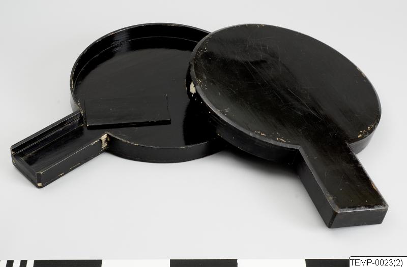 Spegelfodral av trä lackerat i svart, från Japan. Fodralet är i två delar, inuti finns en lös del.