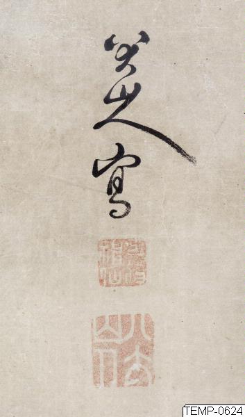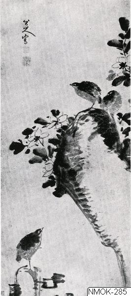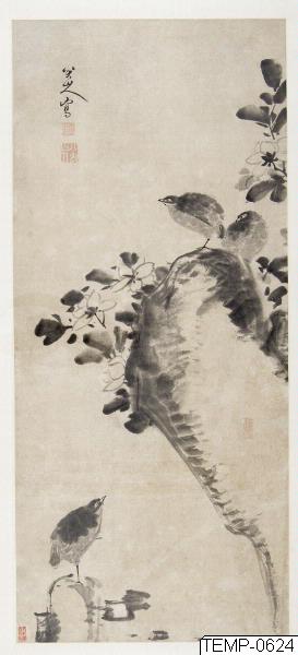 "Tre snäppor." Två av fåglarna befinner sig uppe på en klippa som skjuter snett in i bilden. Den tredje står nedanför på en sten, blickande uppåt mot kamraterna. Buskväxter med stora blommor växer vid klippan. Tusch på papper.