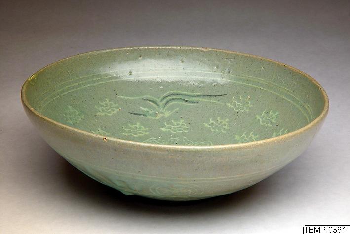 This bowl has a straight rim and sides that taper down in a curve to the base and the foot. A slip inlay technique called "sanggam" was applied for decorating the surface of the bowl with motifs of phoenixes and chrysanthemums. On the interior, a double ring collared with a band of yeouidu (cloud-shaped well-wishing symbols) is placed at the center, followed by a wide register with three flying phoenixes amidst clouds, enclosed by three concentric rings below the rim. The exterior surface bears three equidistant medallions of chrysanthemum flowers inside a double-ring, framed above and below by two sets of double-lines. Except for the phoenixes, the motifs were stamped and not individually incised. The greenish tinged glaze is pooling heavily (especially on the exterior) impairing the clarity of certain decorative elements. Two gaps in the glaze on the exterior of the bowl reveal the body material with the inlaid slip. The footrim has been wiped free of glaze and remains of kiln grit adhere to the glazed base and the foot. This bowl was produced in the late Goryeo period, when the inlaid designs on celadon ceramics became more crowded and stamps began to be used for repetitive patterns. In later Goryeo celadon wares, the color of the glaze changes from a bluish-green, jade-like color to a more greyish-green. Sanggam literally means image (sang) and intaglio or inlay (gam), the inlaying of one material into another. In the case of celadon wares, the sanggam technique involves the process of carving and impressing decorative motifs onto the drying clay and then filling in the shapes with white slip or red ocher clay (fires to black). After glazing and firing, the white and black slip areas would stand out from the body material and create a vivid decorative effect. Sanggam as a decoration technique for celadon wares developed and proliferated in the 12th and 13th century during the Goryeo dynasty (918-1932) and is a unique and representative craft of Goryeo arts.