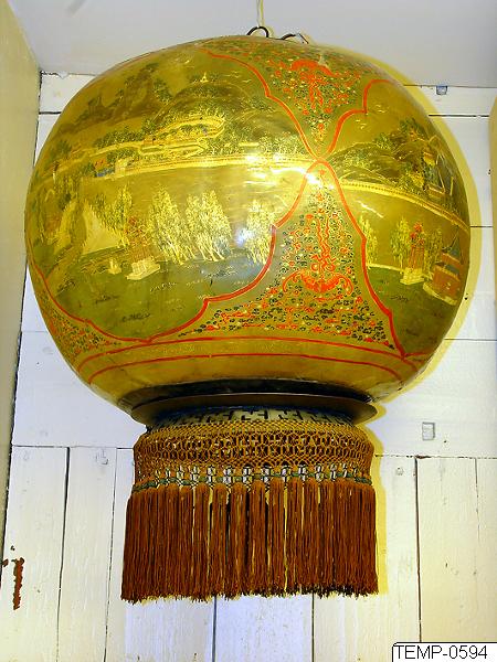 Stor lykta (eller lampa) av horn, textil och metall. med scener från Nya Sommarpalatset. 1800-tal. Lampan har målats med stora medaljonger med landskapsmotiv. Lampan avslutas nedtill med metallfattning dekorerad med genombrutna svastikor följd av textiltofsar. Lyktans skärm består av tunna sammanfogade skivor av horn.